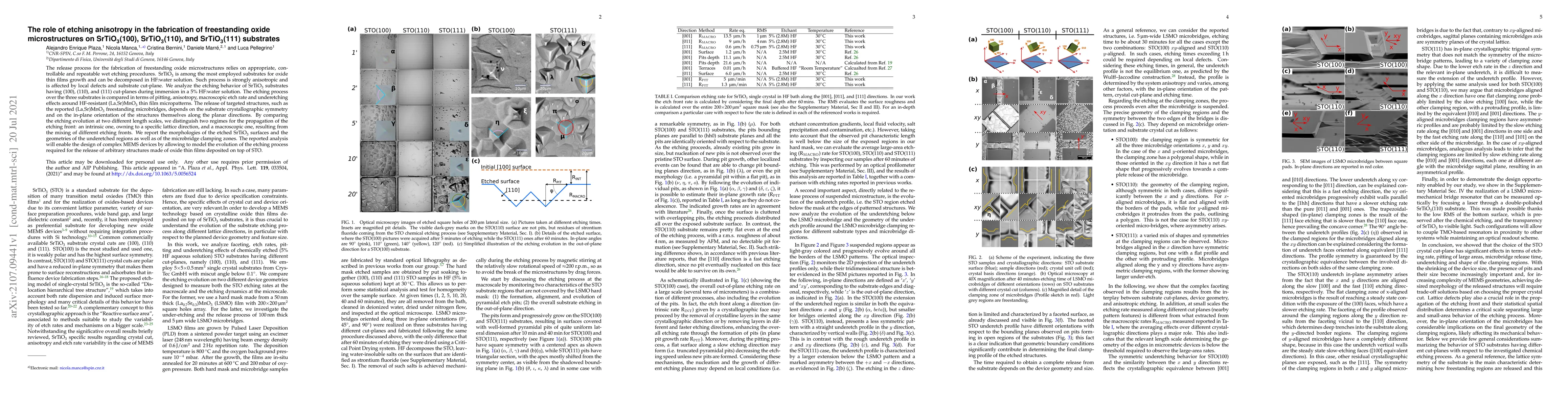 The release process for the fabrication of freestanding oxide microstructures relies on appropriate, controllable and repeatable wet etching procedures. SrTiO3 is among the most employed substrates for oxide thin films growth and can be decomposed in HF:water solution. Such process is strongly anisotropic and is affected by local defects and substrate cut-plane. We analyze the etching behavior of SrTiO3 substrates having (100), (110), and (111) cut-planes during immersion in a 5% HF:water solution. The etching process over the three substrates is compared in terms of pitting, anisotropy, macroscopic etch rate and underetching effects around HF-resistant (La,Sr)MnO3 thin film micropatterns. The release of targeted structures, such as the reported (La,Sr)MnO3 freestanding microbridges, depends on the substrate crystallographic symmetry and on the in-plane orientation of the structures themselves along the planar directions. By comparing the etching evolution at two different length scales, we distinguish two regimes for the propagation of the etching front: an intrinsic one, owning to a specific lattice direction, and a macroscopic one, resulting from the mixing of different etching fronts. We report the morphologies of the etched SrTiO3 surfaces and the geometries of the underetched regions as well as of the microbridge clamping zones. The reported analysis will enable the design of complex MEMS devices by allowing to model the evolution of the etching process required for the release of arbitrary structures made of oxide thin films deposited on top of STO.