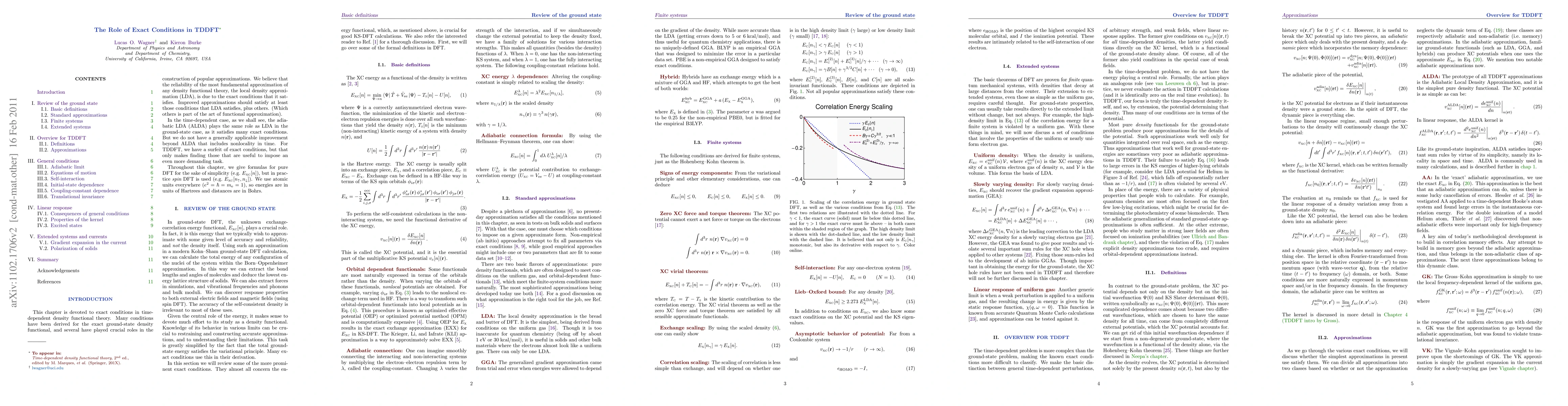 This chapter is devoted to exact conditions in time-dependent density functional theory. Many conditions have been derived for the exact ground-state density functional, and several have played crucial roles in the construction of popular approximations. We believe that the reliability of the most fundamental approximation of any density functional theory, the local density approximation (LDA), is due to the exact conditions that it satisfies. Improved approximations should satisfy at least those conditions that LDA satisfies, plus others. (Which others is part of the art of functional approximation). In the time-dependent case, as we shall see, the adiabatic LDA (ALDA) plays the same role as LDA in the ground-state case, as it satisfies many exact conditions. But we do not have a generally applicable improvement beyond ALDA that includes nonlocality in time. For TDDFT, we have a surfeit of exact conditions, but that only makes finding those that are useful to impose an even more demanding task.