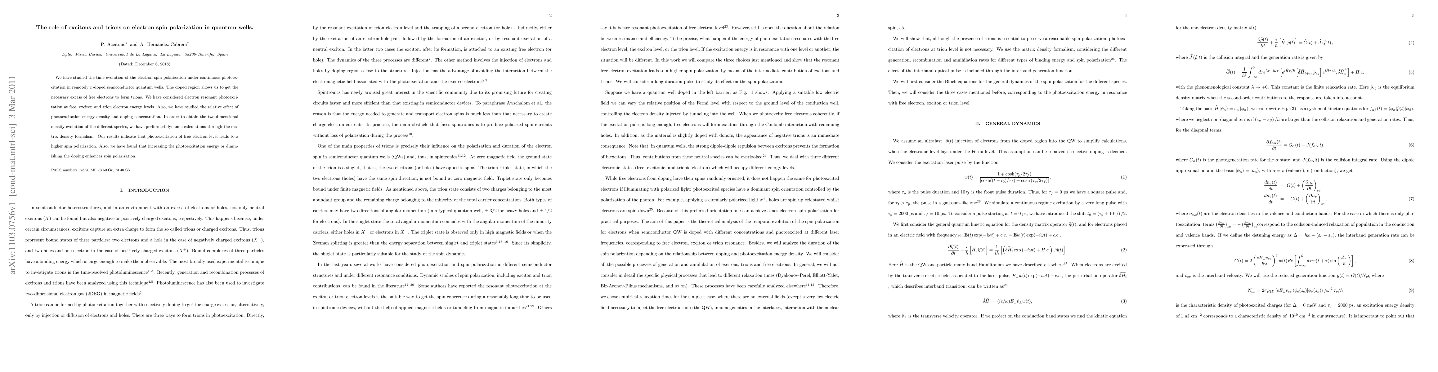 This paper investigates the time evolution of electron spin polarization in quantum wells under continuous photoexcitation, focusing on the roles of excitons and trions. The study reveals that higher spin polarization is achieved through photoexcitation of free electron levels, with increased photoexcitation energy and reduced doping further enhancing spin polarization.