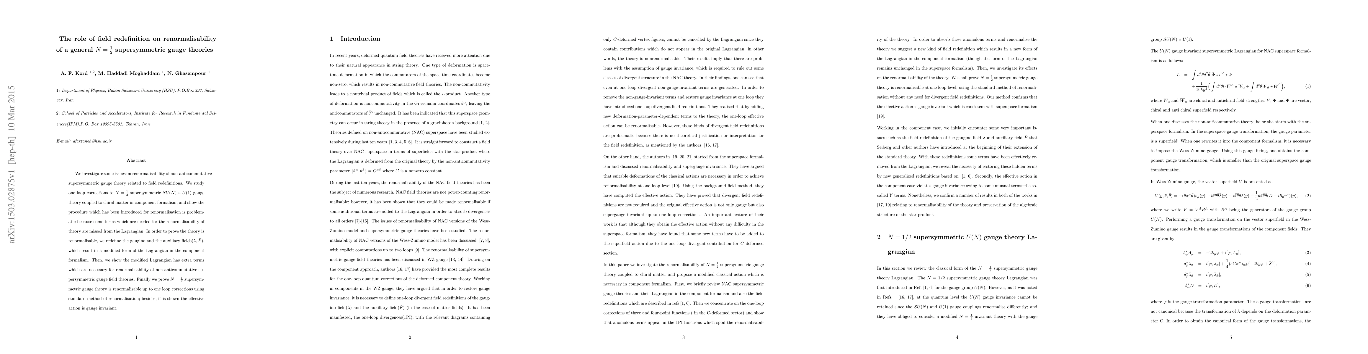 We investigate some issues on renormalisability of non-anticommutative supersymmetric gauge theory related to field redefinitions. We study one loop corrections to $N=\frac{1}{2}$ supersymmetric $SU(N)\times U(1)$ gauge theory coupled to chiral matter in component formalism, and show the procedure which has been introduced for renormalisation is problematic because some terms which are needed for the renormalisability of theory are missed from the Lagrangian. In order to prove the theory is renormalisable, we redefine the gaugino and the auxiliary fields($\lambda, \bar F$), which result in a modified form of the Lagrangian in the component formalism. Then, we show the modified Lagrangian has extra terms which are necessary for renormalisability of non-anticommutative supersymmetric gauge field theories. Finally we prove $N = \frac{1}{2}$ supersymmetric gauge theory is renormalisable up to one loop corrections using standard method of renormalisation; besides, it is shown the effective action is gauge invariant.