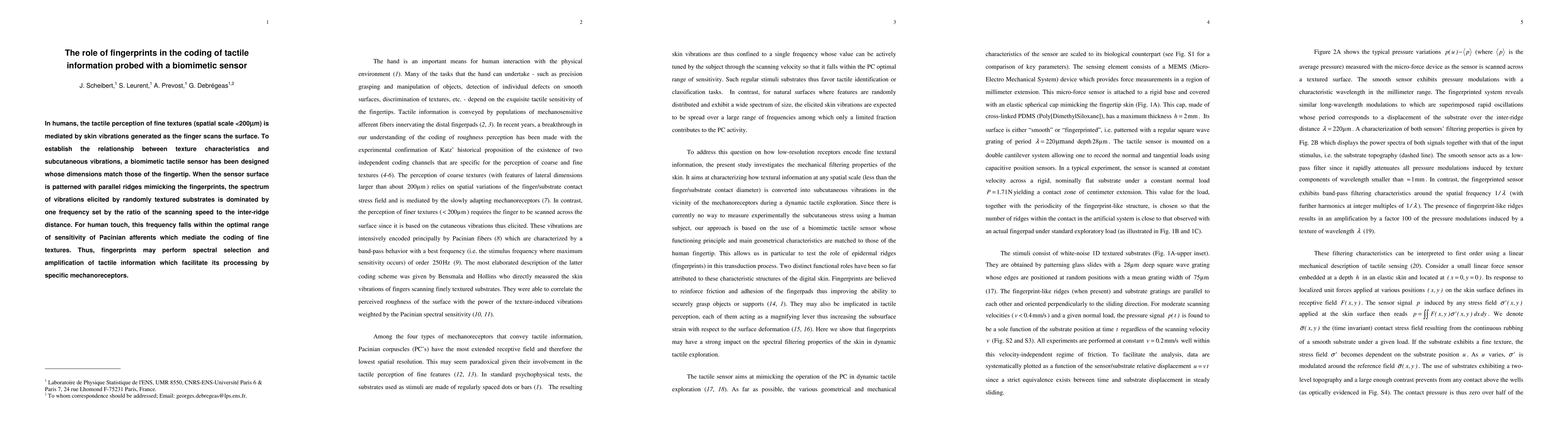 This study investigates how fingerprints influence the tactile perception of fine textures using a biomimetic sensor. The sensor, patterned with ridges mimicking fingerprints, reveals that vibrations from textured surfaces are dominated by a frequency linked to the scanning speed and ridge spacing, falling within the optimal sensitivity range of Pacinian afferents, suggesting fingerprints enhance the coding of tactile information.
