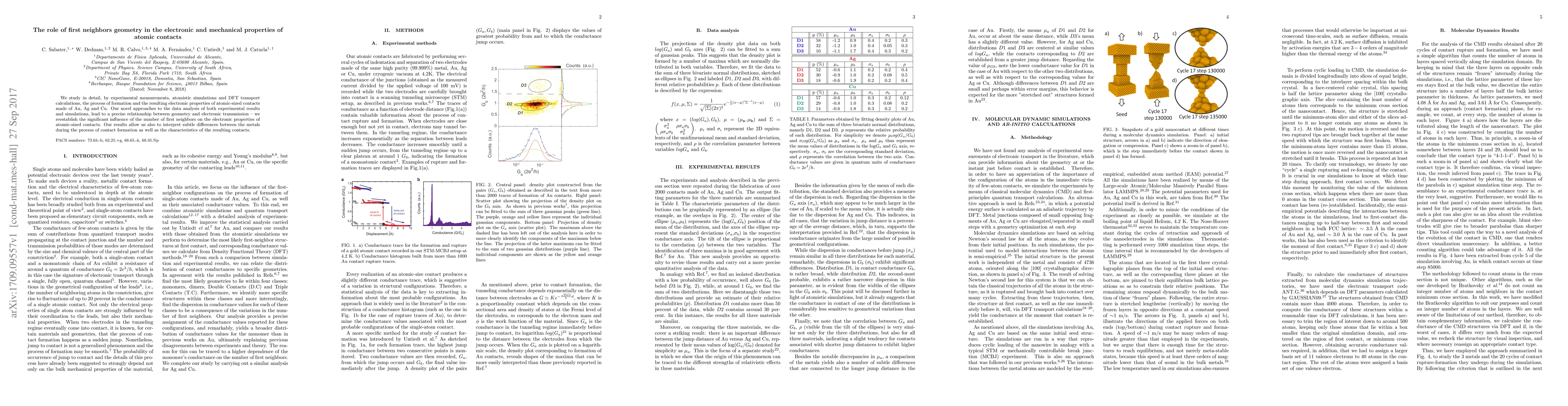 This study experimentally and theoretically investigates the formation and electronic properties of atomic-sized contacts in Au, Ag, and Cu, revealing a precise relationship between first-neighbor geometry and electronic transmission. The findings underscore the significant role of first-neighbor count in determining the electronic characteristics of these contacts.