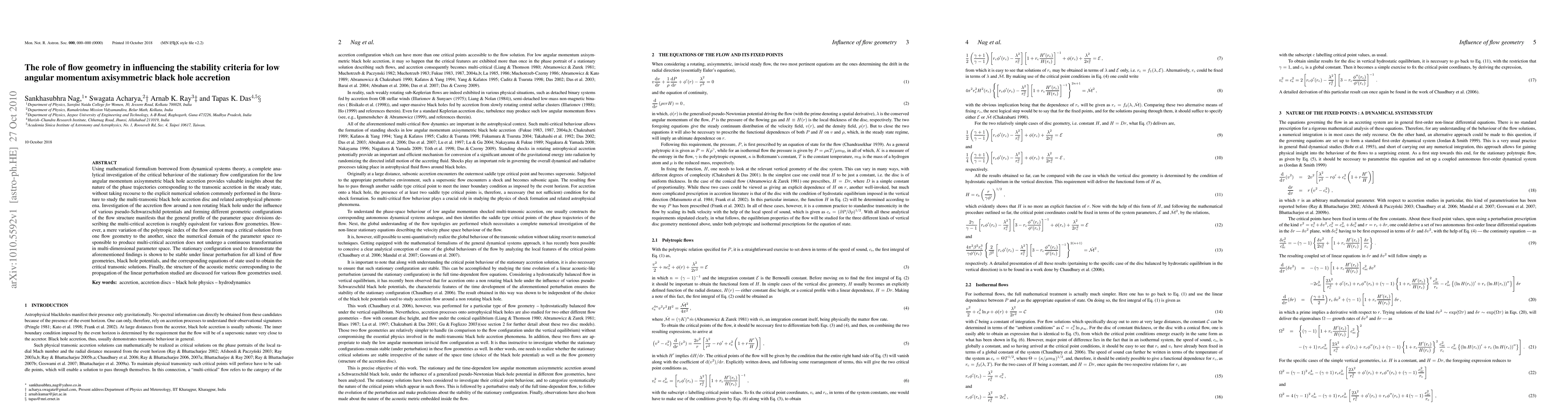 This paper investigates the stability criteria for low angular momentum axisymmetric black hole accretion using dynamical systems theory, revealing that while flow geometry influences the parameter space divisions, it does not continuously transform critical solutions. The stationary flow configurations are shown to be stable under linear perturbations across different geometries.