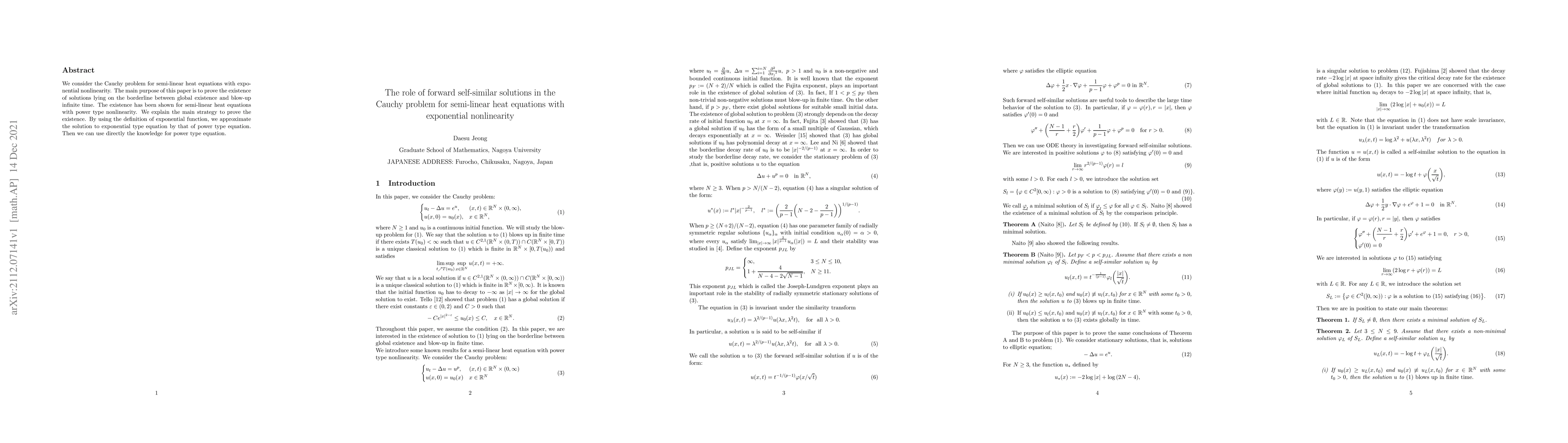 This paper investigates the Cauchy problem for semi-linear heat equations with exponential nonlinearity, proving the existence of solutions on the threshold between global existence and infinite time blow-up. The authors employ a strategy that approximates the exponential nonlinearity solution by a power type solution, leveraging existing knowledge for the latter.