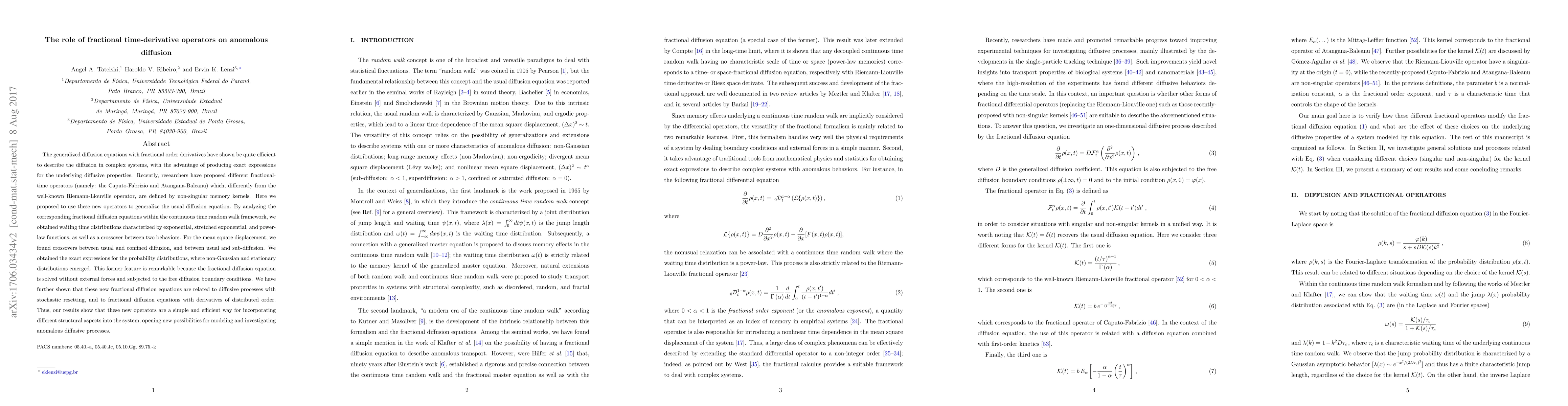 This paper explores the use of fractional time-derivative operators, specifically the Caputo-Fabrizio and Atangana-Baleanu operators, to generalize the diffusion equation, revealing exact expressions for anomalous diffusion in complex systems. The study finds diverse waiting-time distributions and transitions between different diffusion regimes, showcasing the potential of these operators in modeling various diffusive behaviors.