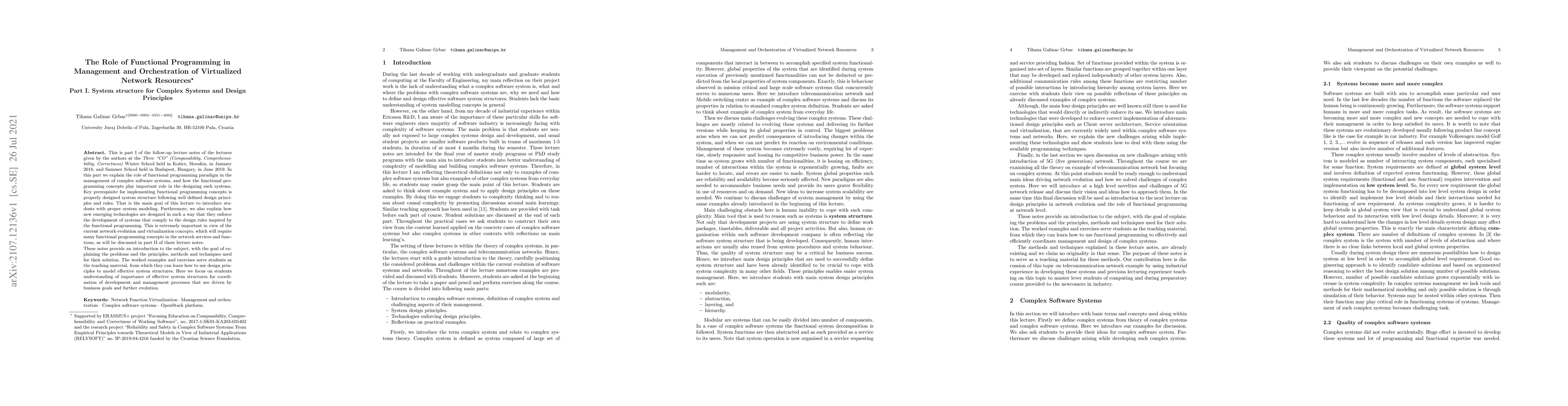 This paper discusses the role of functional programming in managing complex software systems, emphasizing the importance of well-defined system structures and design principles. It introduces students to effective system modeling and the impact of functional programming on the orchestration of virtualized network resources.