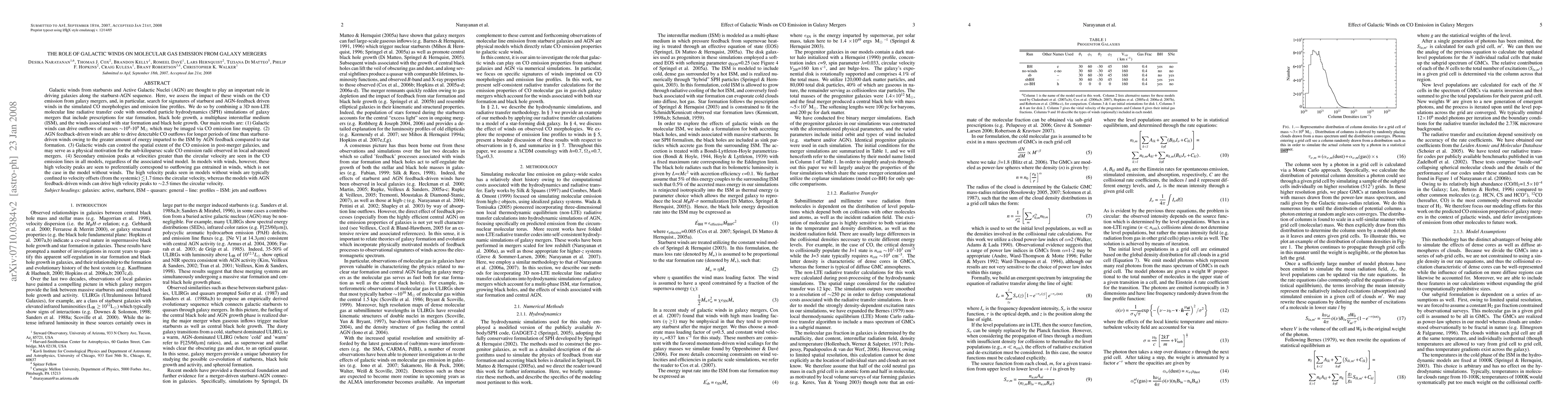This study combines radiative transfer simulations with hydrodynamics to explore how galactic winds from starbursts and AGN feedback affect CO emission in galaxy mergers. The findings indicate that these winds can drive significant CO outflows, with AGN feedback sustaining them longer than starburst-driven winds, and they influence the spatial extent and velocity profiles of CO emissions, particularly in advanced merger stages.