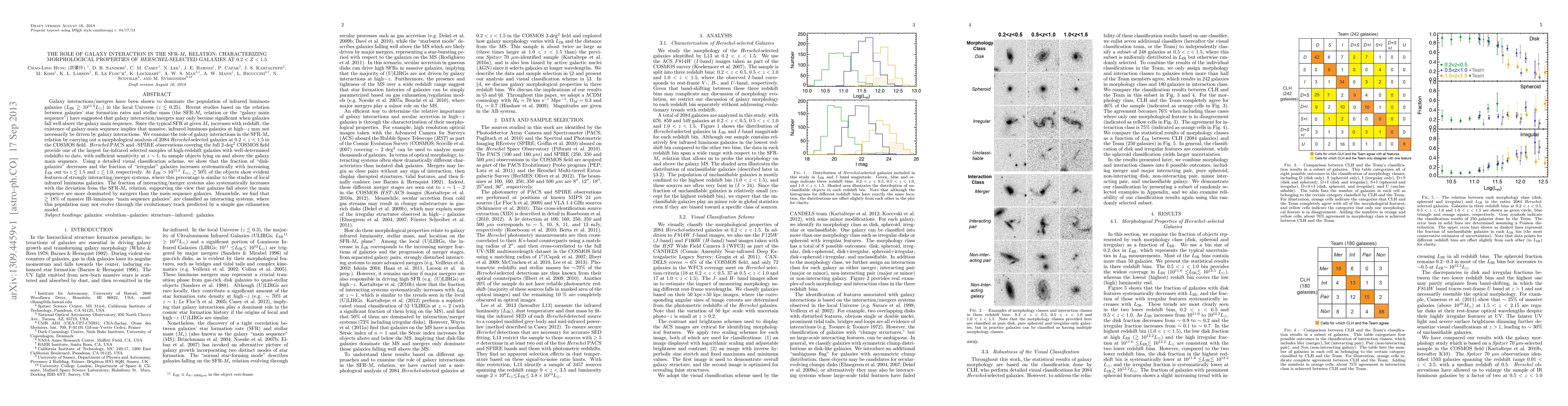 Galaxy interactions/mergers have been shown to dominate the population of IR luminous galaxies (log(LIR)>11.6Lsun) in the local Universe (z<0.25). Recent studies based on the relation between galaxies' star formation rates and stellar mass (the SFR-M relation or the galaxy main sequence (MS)) have suggested that galaxy interaction/mergers may only become significant when galaxies fall well above the galaxy MS. Since the typical SFR at given M increases with redshift, the existence of galaxy MS implies that massive, IR-luminous galaxies at high-z may not necessarily be driven by galaxy interactions. We examine the role of galaxy interactions in the SFR-M relation by carrying out a morphological analysis of 2084 Herschel-selected galaxies at 0.2 < z < 1.5 in the COSMOS field. Herschel-PACS and -SPIRE observations covering the full 2-deg^2 COSMOS field provide one of the largest far-IR selected samples of high-redshift galaxies with well-determined redshifts to date, with sufficient sensitivity at z ~ 1, to sample objects lying on and above the galaxy MS. Using a detailed visual classification scheme, we show that the fraction of "disk galaxies" decreases and the fraction of "irregular" galaxies increases systematically with increasing LIR out to z ~ 1.5 and z ~ 1.0, respectively. At log(LIR) > 11.5 Lsun, >50% of the objects show evident features of strongly interacting/merger systems, where this percentage is similar to the studies of local IR-luminous galaxies. The fraction of interacting/merger systems also systematically increases with the deviation from the SFR-M relation, supporting the view that galaxies fall above the MS are more dominated by mergers than the MS galaxies. Meanwhile, we find that ~18% of massive IR-luminous MS galaxies are classified as interacting systems, where this population may not evolve through the evolutionary track predicted by a simple gas exhaustion model.