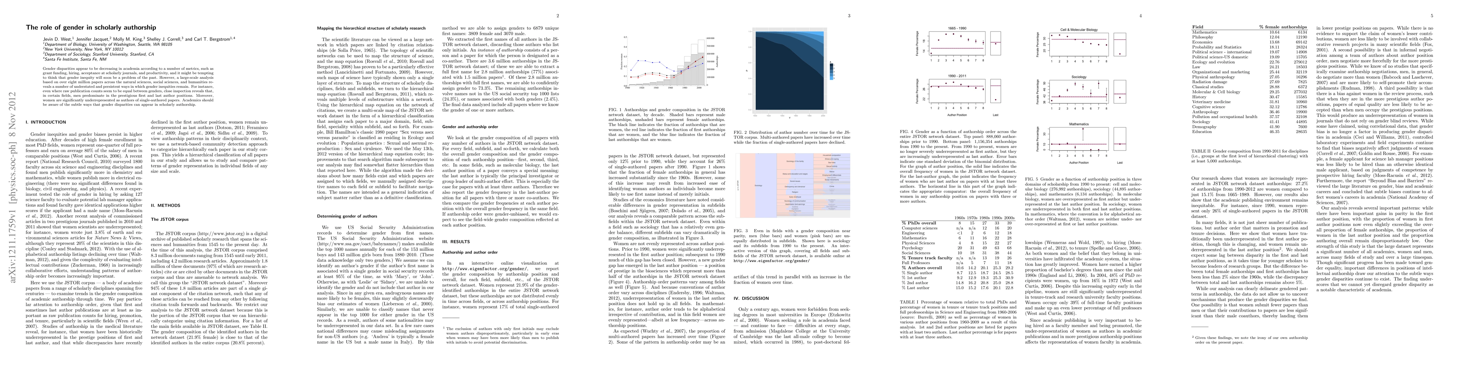 Gender disparities appear to be decreasing in academia according to a number of metrics, such as grant funding, hiring, acceptance at scholarly journals, and productivity, and it might be tempting to think that gender inequity will soon be a problem of the past. However, a large-scale analysis based on over eight million papers across the natural sciences, social sciences, and humanities re- reveals a number of understated and persistent ways in which gender inequities remain. For instance, even where raw publication counts seem to be equal between genders, close inspection reveals that, in certain fields, men predominate in the prestigious first and last author positions. Moreover, women are significantly underrepresented as authors of single-authored papers. Academics should be aware of the subtle ways that gender disparities can appear in scholarly authorship.