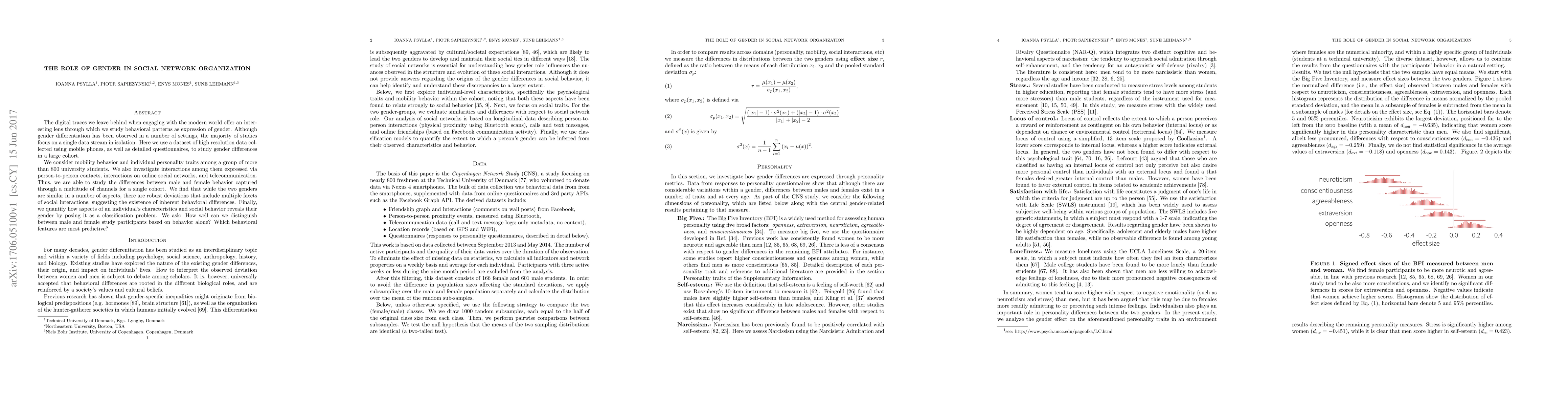 The digital traces we leave behind when engaging with the modern world offer an interesting lens through which we study behavioral patterns as expression of gender. Although gender differentiation has been observed in a number of settings, the majority of studies focus on a single data stream in isolation. Here we use a dataset of high resolution data collected using mobile phones, as well as detailed questionnaires, to study gender differences in a large cohort. We consider mobility behavior and individual personality traits among a group of more than $800$ university students. We also investigate interactions among them expressed via person-to-person contacts, interactions on online social networks, and telecommunication. Thus, we are able to study the differences between male and female behavior captured through a multitude of channels for a single cohort. We find that while the two genders are similar in a number of aspects, there are robust deviations that include multiple facets of social interactions, suggesting the existence of inherent behavioral differences. Finally, we quantify how aspects of an individual's characteristics and social behavior reveals their gender by posing it as a classification problem. We ask: How well can we distinguish between male and female study participants based on behavior alone? Which behavioral features are most predictive?
