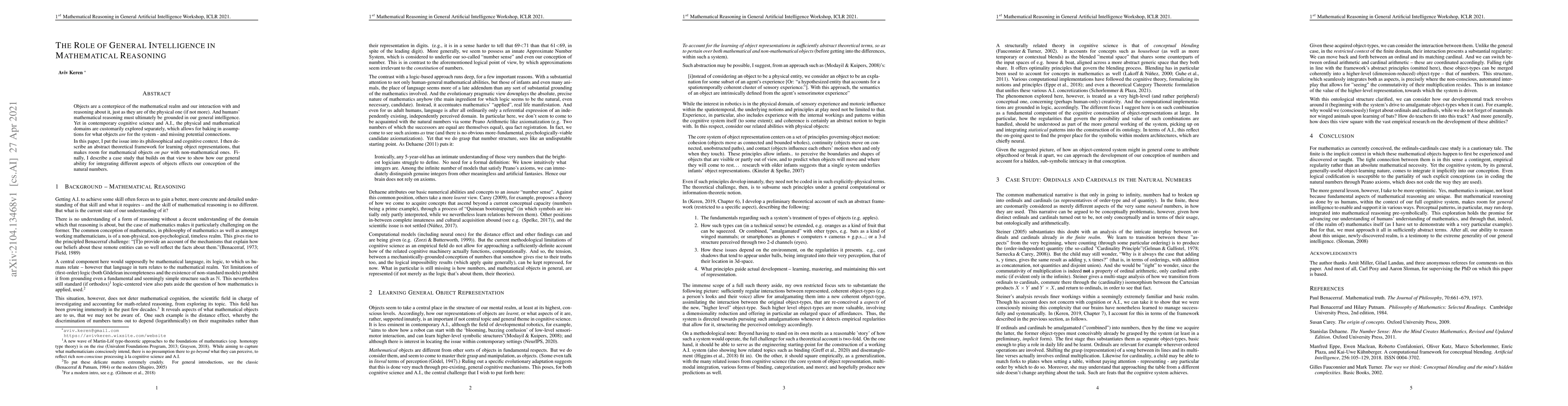 This paper explores the connection between general intelligence and mathematical reasoning, arguing that mathematical objects should be treated similarly to physical objects in cognitive frameworks. It proposes a theoretical model for learning object representations that integrates mathematical and non-mathematical domains, and demonstrates its application through a case study on the conception of natural numbers.