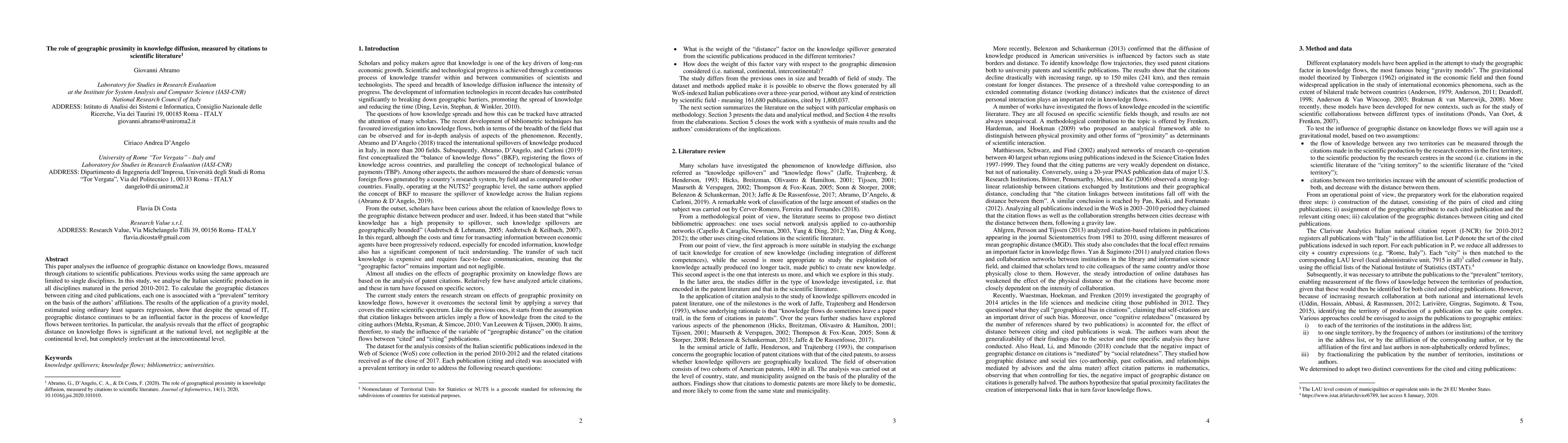 This paper examines the impact of geographic distance on knowledge diffusion across all disciplines in Italy (2010-2012) using a gravity model and citation analysis. Despite advancements in information technology, geographic proximity remains a significant factor in knowledge flows at national and continental levels but not at intercontinental levels.