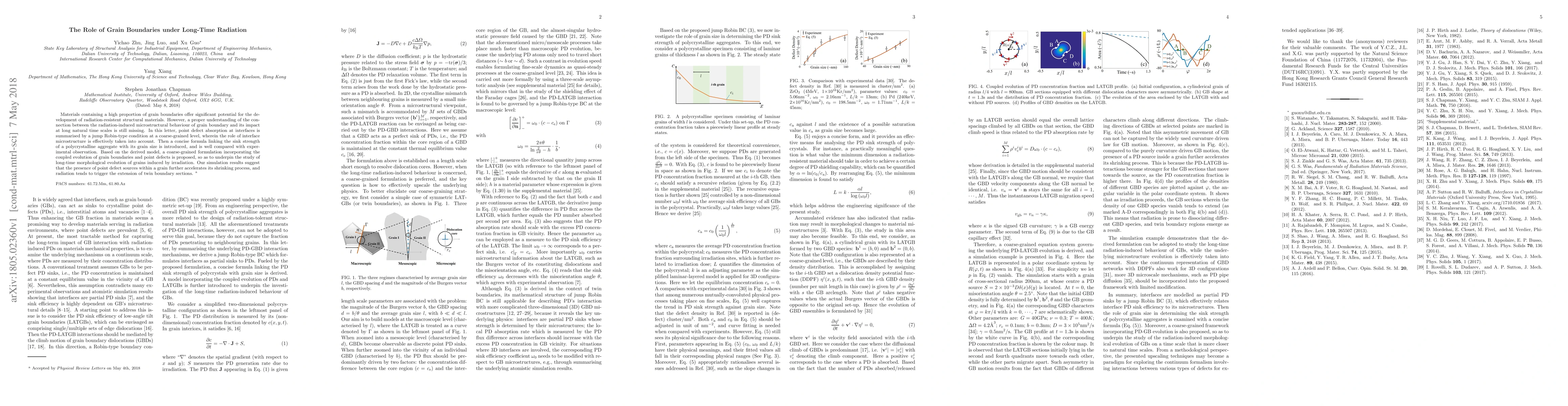 This paper proposes a coarse-grained model to understand the long-term radiation-induced microstructural behavior of grain boundaries in materials, linking sink strength to grain size and showing that point defect sources accelerate grain shrinking and promote twin boundary extension. Experimental observations support the model's predictions.