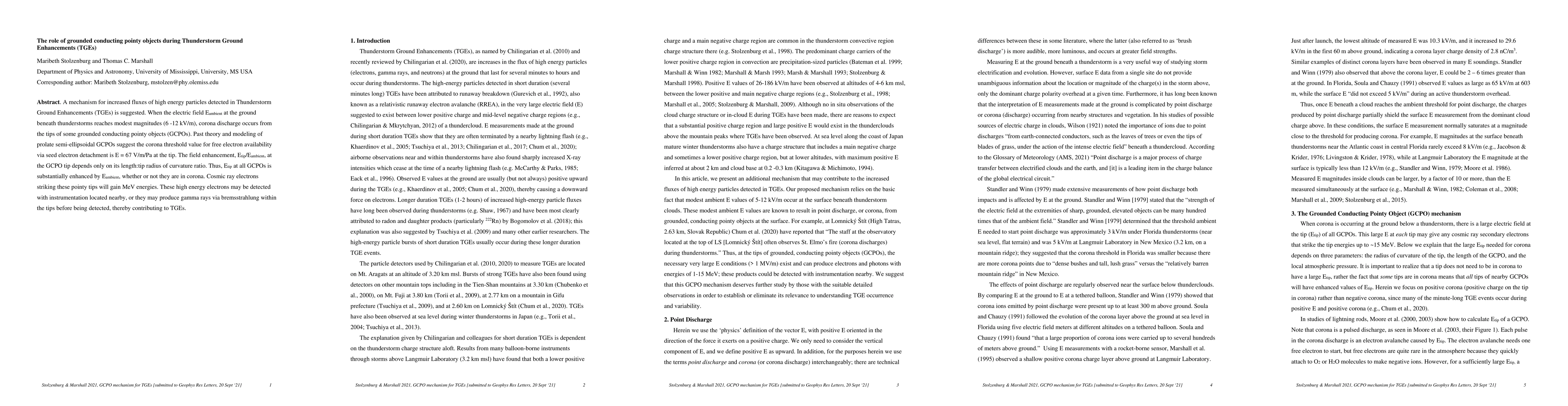 This paper proposes that grounded conducting pointy objects (GCPOs) enhance high-energy particle fluxes during Thunderstorm Ground Enhancements (TGEs) by inducing corona discharges when the ambient electric field reaches 6-12 kV/m, leading to MeV electron energies and potential gamma ray production via bremsstrahlung. The field enhancement at GCPO tips is directly proportional to the length-to-radius ratio.