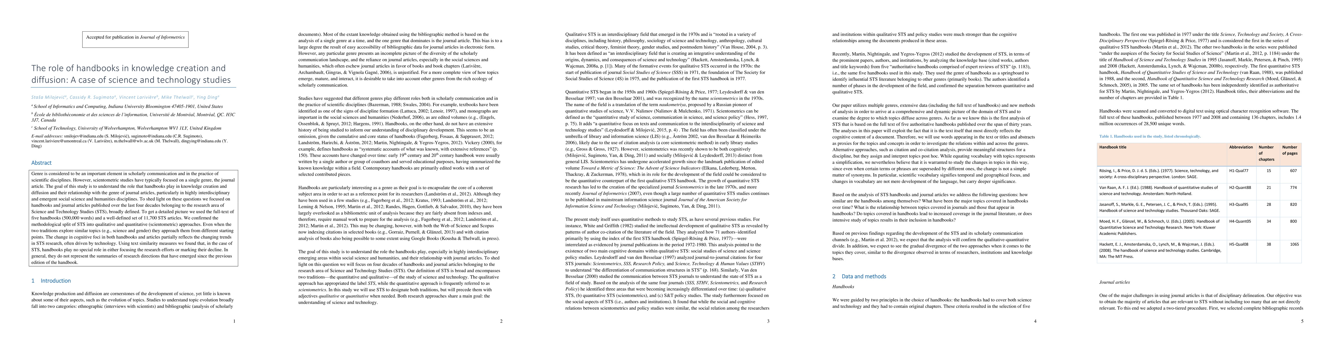 Genre is considered to be an important element in scholarly communication and in the practice of scientific disciplines. However, scientometric studies have typically focused on a single genre, the journal article. The goal of this study is to understand the role that handbooks play in knowledge creation and diffusion and their relationship with the genre of journal articles, particularly in highly interdisciplinary and emergent social science and humanities disciplines. To shed light on these questions we focused on handbooks and journal articles published over the last four decades belonging to the research area of Science and Technology Studies (STS), broadly defined. To get a detailed picture we used the full-text of five handbooks (500,000 words) and a well-defined set of 11,700 STS articles. We confirmed the methodological split of STS into qualitative and quantitative (scientometric) approaches. Even when the two traditions explore similar topics (e.g., science and gender) they approach them from different starting points. The change in cognitive foci in both handbooks and articles partially reflects the changing trends in STS research, often driven by technology. Using text similarity measures we found that, in the case of STS, handbooks play no special role in either focusing the research efforts or marking their decline. In general, they do not represent the summaries of research directions that have emerged since the previous edition of the handbook.