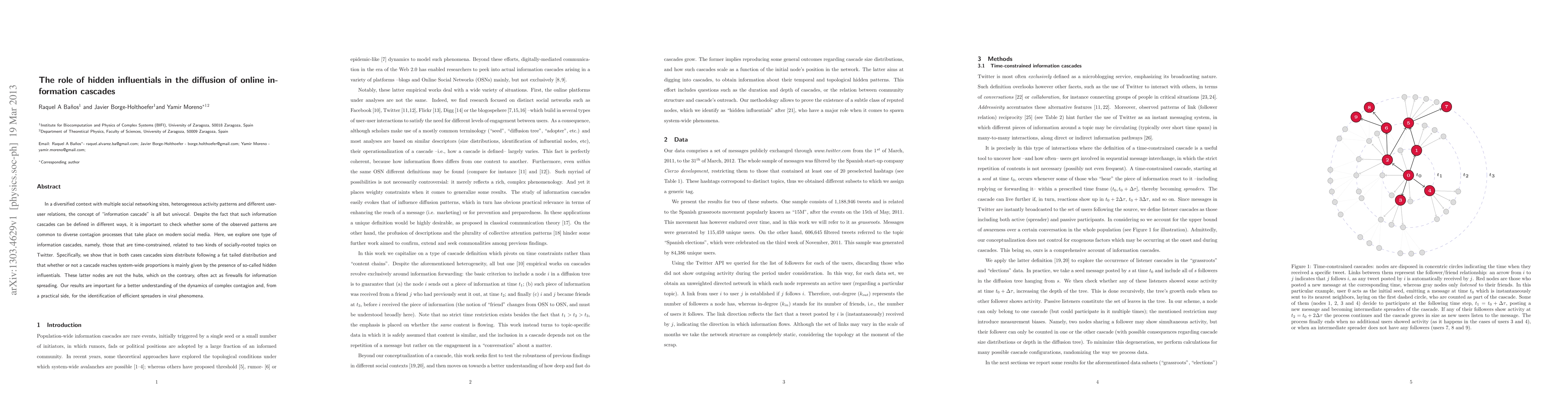 In a diversified context with multiple social networking sites, heterogeneous activity patterns and different user-user relations, the concept of "information cascade" is all but univocal. Despite the fact that such information cascades can be defined in different ways, it is important to check whether some of the observed patterns are common to diverse contagion processes that take place on modern social media. Here, we explore one type of information cascades, namely, those that are time-constrained, related to two kinds of socially-rooted topics on Twitter. Specifically, we show that in both cases cascades sizes distribute following a fat tailed distribution and that whether or not a cascade reaches system-wide proportions is mainly given by the presence of so-called hidden influentials. These latter nodes are not the hubs, which on the contrary, often act as firewalls for information spreading. Our results are important for a better understanding of the dynamics of complex contagion and, from a practical side, for the identification of efficient spreaders in viral phenomena.