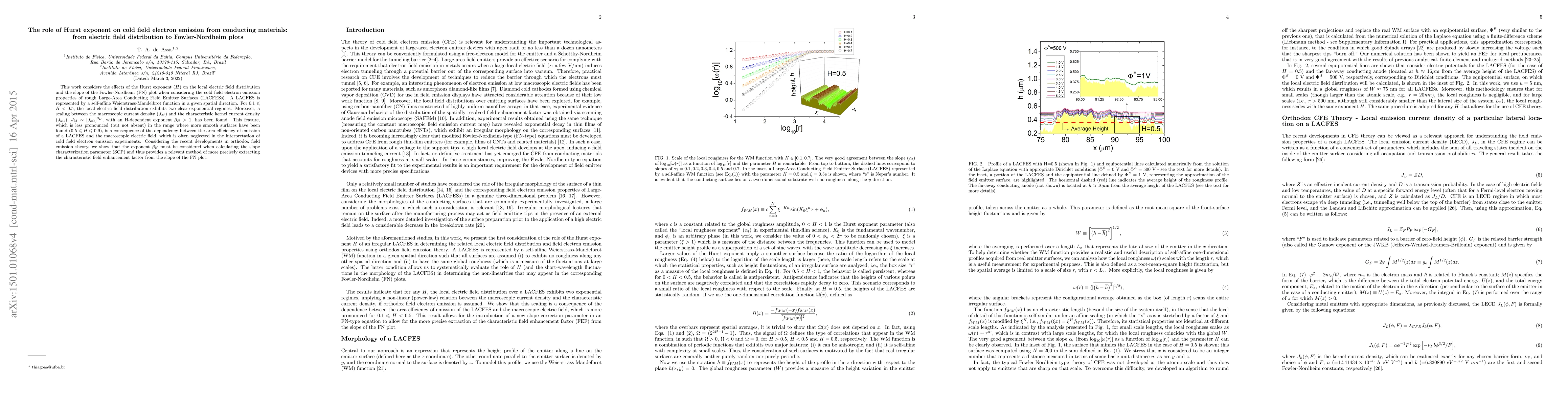 This paper investigates the influence of the Hurst exponent ($H$) on the electric field distribution and Fowler-Nordheim plot slope in cold field electron emission from rough conducting surfaces. It finds that for $0.1 \leqslant H < 0.5$, the local electric field distribution shows distinct exponential regimes, and a scaling relationship between macroscopic and characteristic kernel current density is identified, which depends on $H$ and affects the slope characterization parameter in Fowler-Nordheim plots.