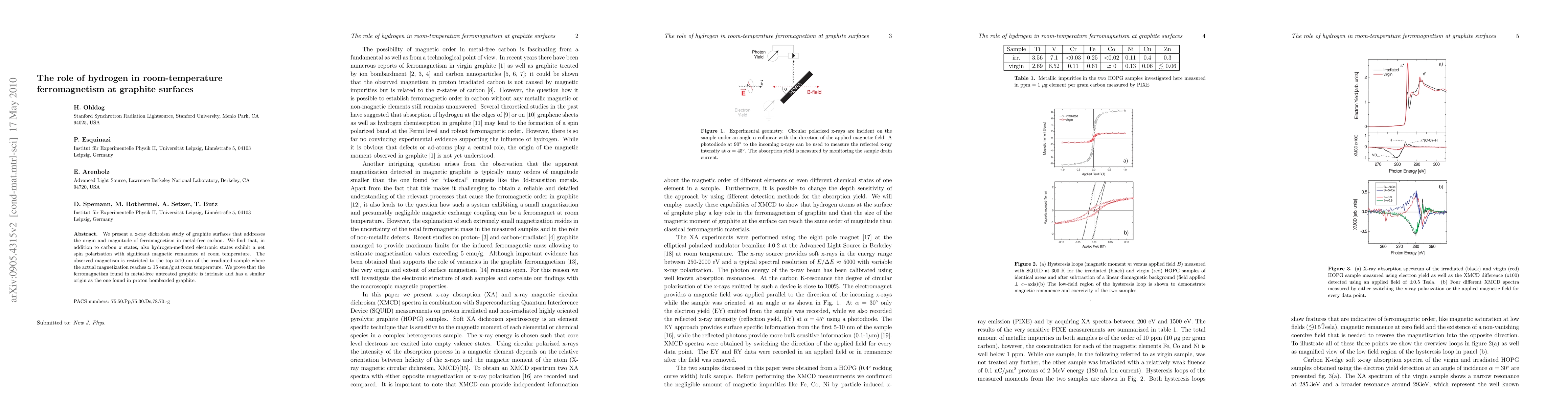 We present a x-ray dichroism study of graphite surfaces that addresses the origin and magnitude of ferromagnetism in metal-free carbon. We find that, in addition to carbon $\pi$ states, also hydrogen-mediated electronic states exhibit a net spin polarization with significant magnetic remanence at room temperature. The observed magnetism is restricted to the top $\approx$10 nm of the irradiated sample where the actual magnetization reaches $ \simeq 15$ emu/g at room temperature. We prove that the ferromagnetism found in metal-free untreated graphite is intrinsic and has a similar origin as the one found in proton bombarded graphite.