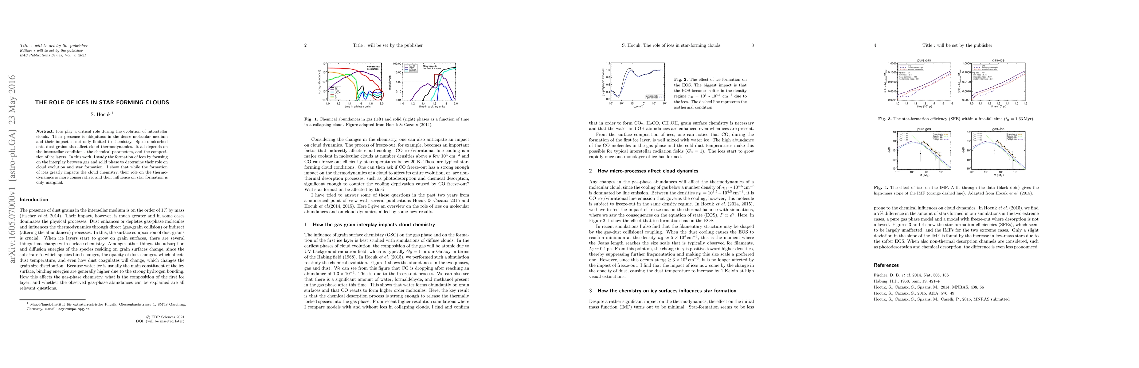 Ices play a critical role during the evolution of interstellar clouds. Their presence is ubiquitous in the dense molecular medium and their impact is not only limited to chemistry. Species adsorbed onto dust grains also affect cloud thermodynamics. It all depends on the interstellar conditions, the chemical parameters, and the composition of ice layers. In this work, I study the formation of ices by focusing on the interplay between gas and solid phase to determine their role on cloud evolution and star formation. I show that while the formation of ices greatly impacts the cloud chemistry, their role on the thermodynamics is more conservative, and their influence on star formation is only marginal.
