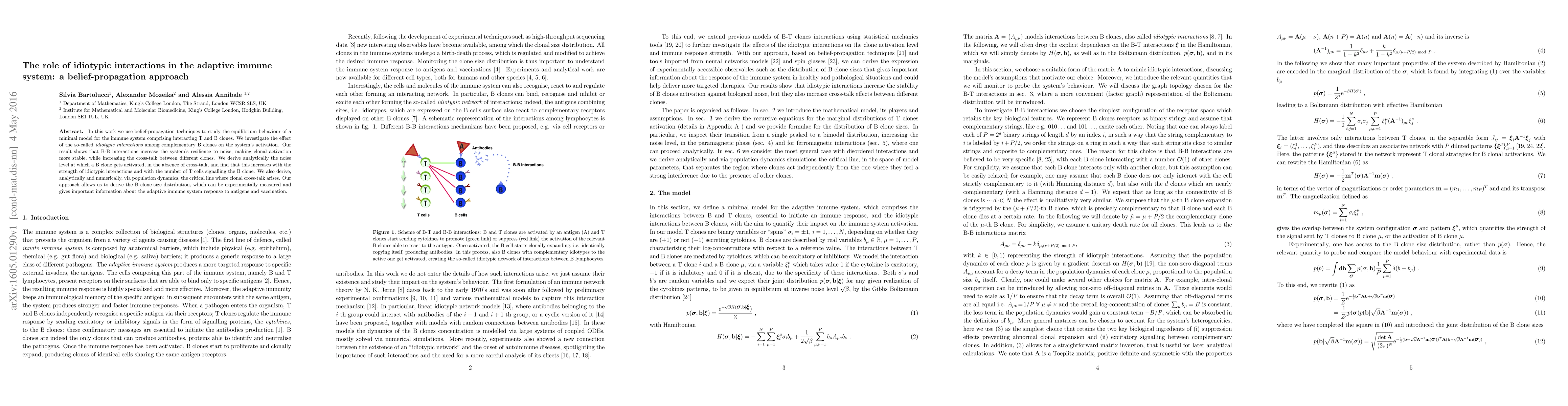 This paper employs belief-propagation techniques to model idiotypic interactions in the adaptive immune system, demonstrating that B-B interactions enhance system resilience and clonal activation stability. The study analytically determines the noise level for B clone activation and the critical point for clonal cross-talk, providing insights into immune response and vaccination efficacy.