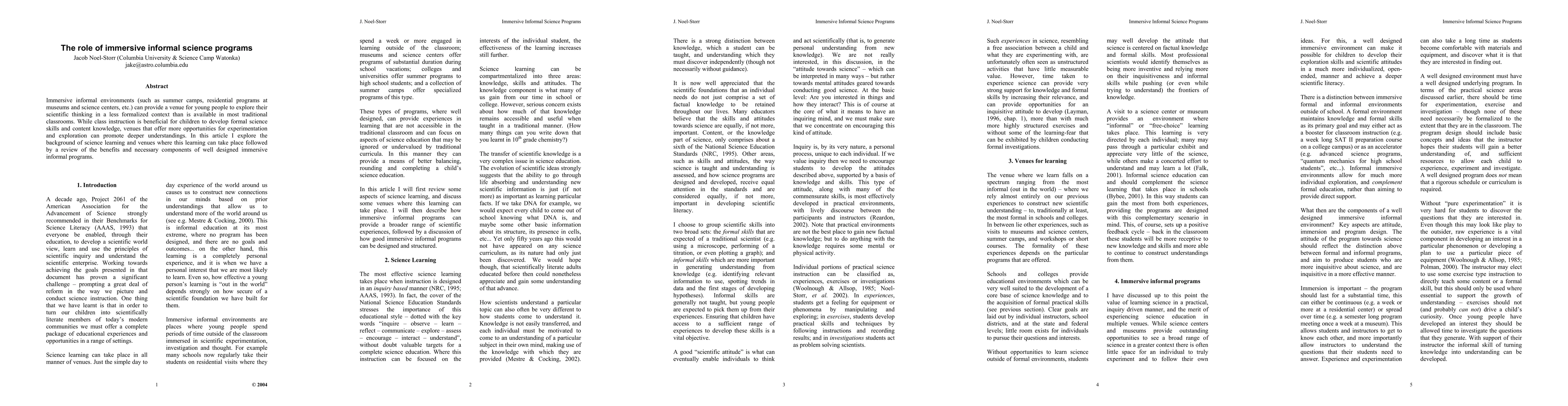 Immersive informal environments (such as summer camps, residential programs at museums and science centers, etc.) can provide a venue for young people to explore their scientific thinking in a less formalized context than is available in most traditional classrooms. While class instruction is beneficial for children to develop formal science skills and content knowledge, venues that offer more opportunities for experimentation and exploration can promote deeper understandings. In this article I explore the background of science learning and venues where this learning can take place followed by a review of the benefits and necessary components of well designed immersive informal programs.