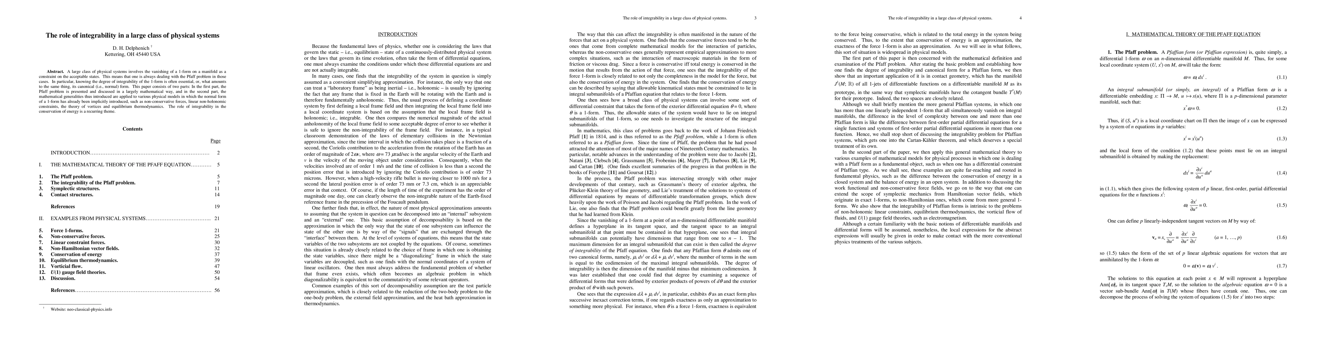 A large class of physical systems involves the vanishing of a 1-form on a manifold as a constraint on the acceptable states. This means that one is always dealing with the Pfaff problem in those cases. In particular, knowing the degree of integrability of the 1-form is often essential, or, what amounts to the same thing, its canonical (i.e., normal) form. This paper consists of two parts: In the first part, the Pfaff problem is presented and discussed in a largely mathematical way, and in the second part, the mathematical generalities thus introduced are applied to various physical models in which the normal form of a 1-form has already been implicitly introduced, such as non-conservative forces, linear non-holonomic constraints, the theory of vortices and equilibrium thermodynamics. The role of integrability in the conservation of energy is a recurring theme.