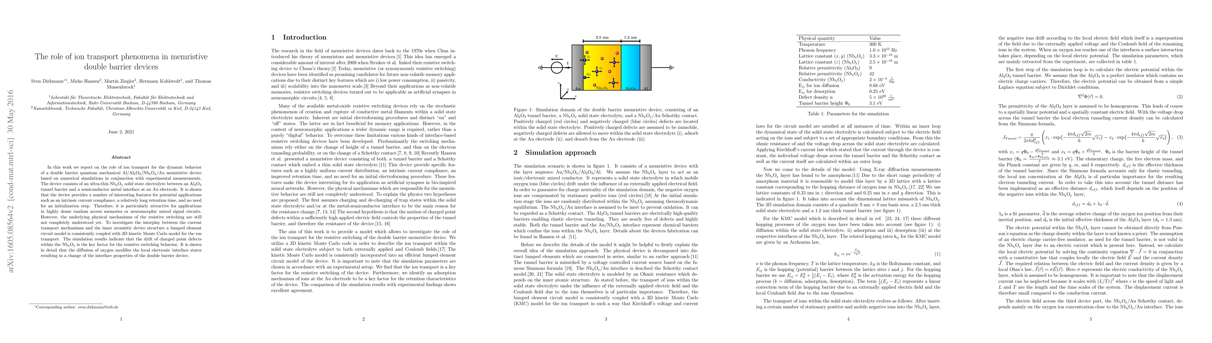 In this work we report on the role of ion transport for the dynamic behavior of a double barrier quantum mechanical Al/Al$_2$O$_3$/Nb$_{\text{x}}$O$_{\text{y}}$/Au memristive device based on numerical simulations in conjunction with experimental measurements. The device consists of an ultra-thin Nb$_{\text{x}}$O$_{\text{y}}$ solid state electrolyte between an Al$_2$O$_3$ tunnel barrier and a semiconductor metal interface at an Au electrode. It is shown that the device provides a number of interesting features for potential applications such as an intrinsic current compliance, a relatively long retention time, and no need for an initialization step. Therefore, it is particularly attractive for applications in highly dense random access memories or neuromorphic mixed signal circuits. However, the underlying physical mechanisms of the resistive switching are still not completely understood yet. To investigate the interplay between the current transport mechanisms and the inner atomistic device structure a lumped element circuit model is consistently coupled with 3D kinetic Monte Carlo model for the ion transport. The simulation results indicate that the drift of charged point defects within the Nb$_{\text{x}}$O$_{\text{y}}$ is the key factor for the resistive switching behavior. It is shown in detail that the diffusion of oxygen modifies the local electronic interface states resulting in a change of the interface properties of the double barrier device.