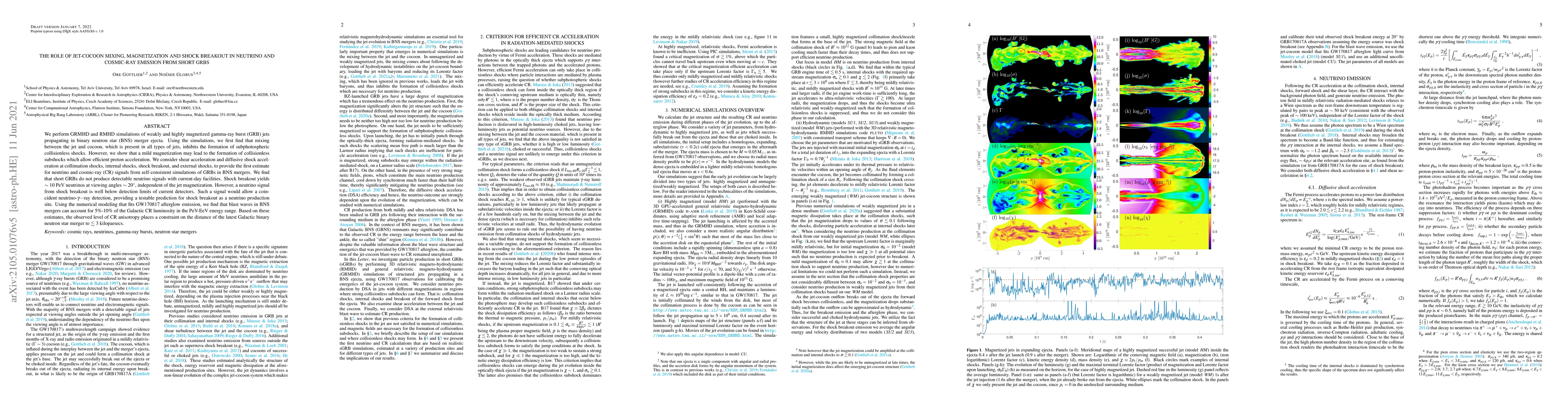 This paper uses GRMHD and RMHD simulations to study the neutrino and cosmic-ray emissions from short GRBs in binary neutron star mergers. It finds that jet-cocoon mixing inhibits subphotospheric shock formation but mild magnetization can enable efficient proton acceleration. The study concludes that short GRBs do not produce detectable neutrino signals with current detectors, though shock breakout could yield high-energy neutrinos, and blast waves from these mergers may contribute to Galactic cosmic rays.