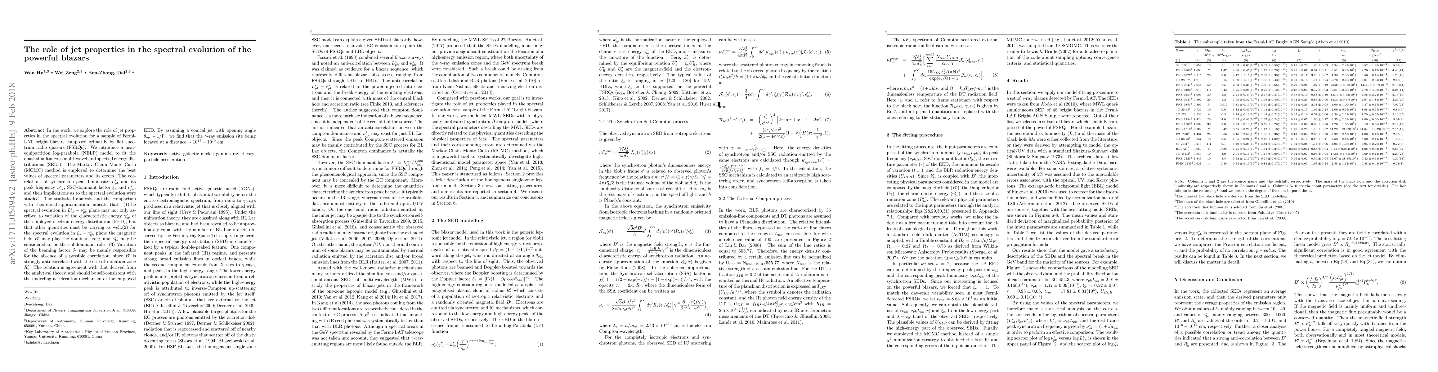 In the work, we explore the role of jet properties in the spectral evolution for a sample of Fermi-LAT bright blazars composed primarily by flat spectrum radio quasars (FSRQs). We introduce a near-equipartition log-parabola (NELP) model to fit the quasi-simultaneous multi-waveband spectral energy distributions (SEDs). The Markov Chain Monte Carlo (MCMC) method is employed to determine the best values of spectral parameters and its errors. The correlations of synchrotron peak luminosity $L_{pk}^*$ and its peak frequency $\nu_{pk}^*$, SSC-dominant factor $\xi_s$ and $\nu_{pk}^*$, and their implications as to the spectral evolution were studied. The statistical analysis and the comparison with theoretical approximation indicate that: (1)the spectral evolution in $L_{pk}^*-\nu_{pk}^*$ plane may not only ascribed to variation of the characteristic energy $\gamma_{br}^\prime$ of the employed electron energy distribution (EED), but that other quantities must be varying as well.(2) for the spectral evolution in $\xi_s-\nu_{pk}^*$ plane the magnetic field $B^\prime$ may play the dominant role, and $\gamma_{br}^\prime$ may be considered to be the subdominant role. (3) Variation of the beaming factor $\delta_b$ may be mainly responsible for the absence of a possible correlation, since $B^\prime$ is strongly anti-correlated with the size of radiation zone $R_b^\prime$. The relation is agreement with that derived from the analytical theory, and should be self-consistent with the underling acceleration mechanism of the employed EED. By assuming a conical jet with opening angle $\theta_{op}\sim1/\Gamma_b$, we find that the $\gamma$-ray emission site being located at a distance $\sim10^{17}-10^{19}$ cm.