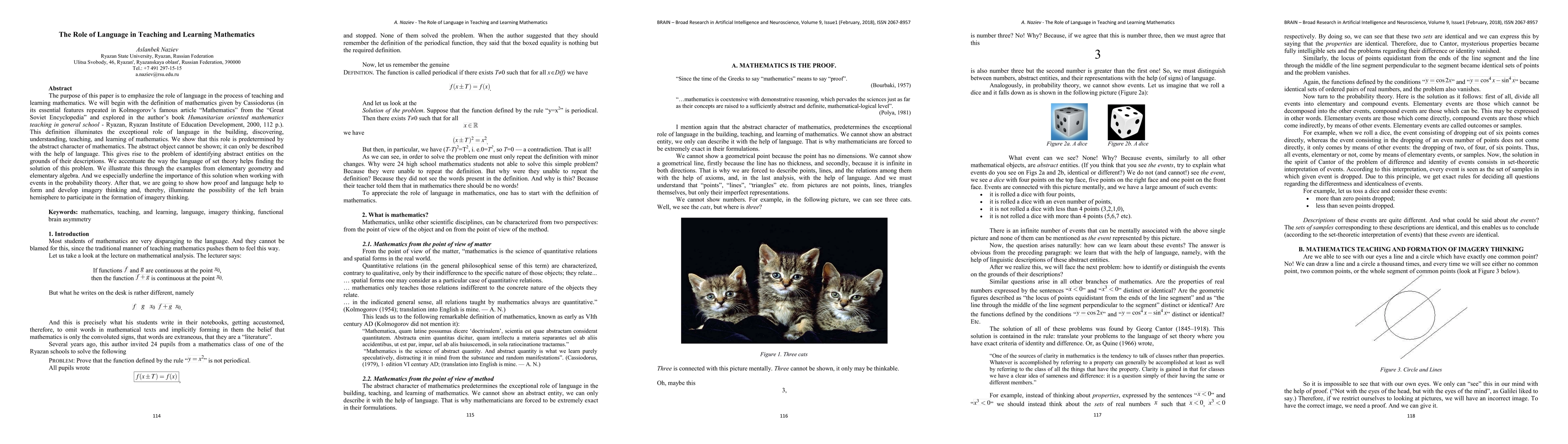 The purpose of this paper is to emphasize the role of language in the process of teaching and learning mathematics. We will begin with the definition of mathematics given by Cassiodorus (in its essential features repeated in Kolmogorov's famous article "Mathematics" from the "Great Soviet Encyclopedia" and explored in the author's book "Humanitarian oriented mathematics teaching in general school" (Ryazan, Ryazan Institute of Education Development, 2000, 112 p.). This definition illuminates the exceptional role of language in the building, discovering, understanding, teaching, and learning of mathematics. We show that this role is predetermined by the abstract character of mathematics. The abstract object cannot be shown; it can only be described with the help of language. This gives rise to the problem of identifying abstract entities on the grounds of their descriptions. We accentuate the way the language of set theory helps finding the solution to this problem. We illustrate this through the examples from elementary geometry and elementary algebra. And we especially underline the importance of this solution when working with events in the probability theory. After that, we are going to show how proof and language help to form and develop imagery thinking and, thereby, illuminate the possibility of the left brain hemisphere to participate in the formation of imagery thinking. Keywords: mathematics, teaching, and learning, language, imagery thinking, functional brain asymmetry