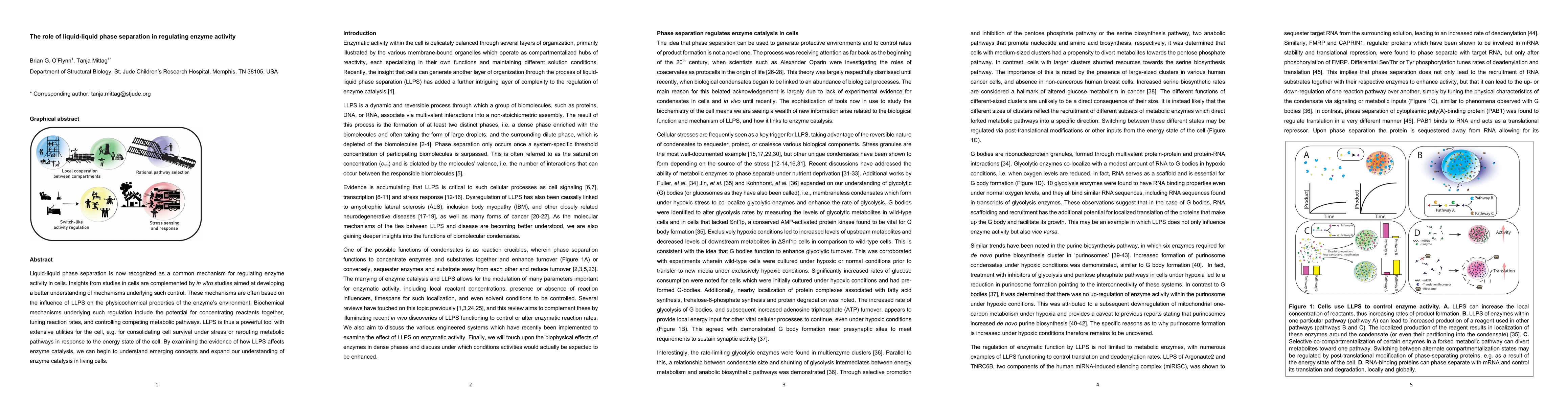 This paper explores how liquid-liquid phase separation (LLPS) regulates enzyme activity in cells, highlighting its role in concentrating reactants, tuning reaction rates, and controlling metabolic pathways. It underscores LLPS as a vital mechanism for cellular survival under stress and metabolic rerouting.