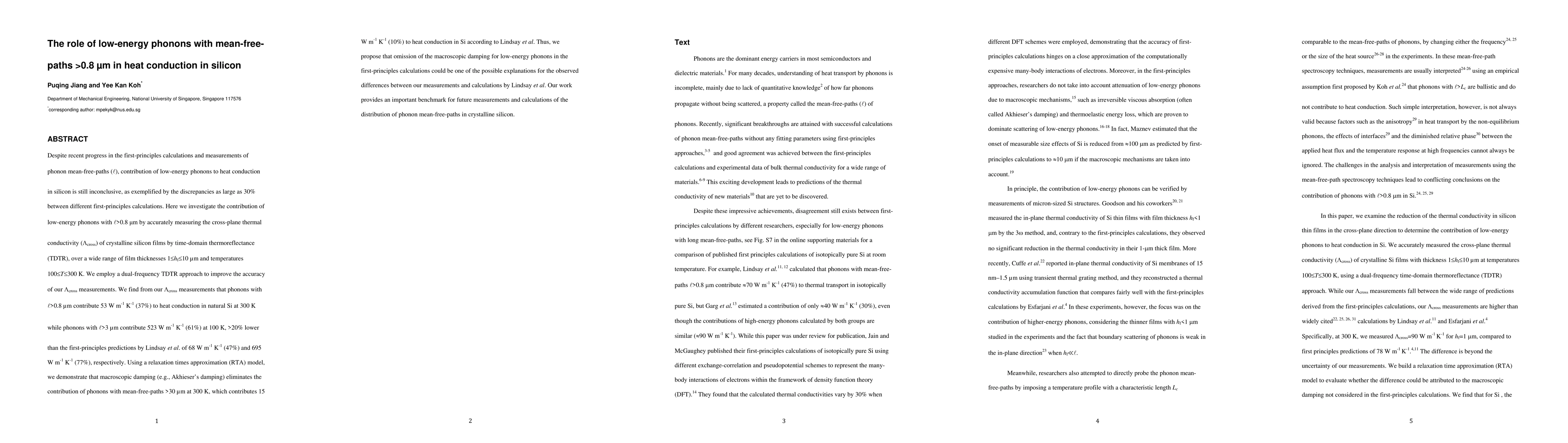 This study investigates the thermal conductivity contribution of low-energy phonons in silicon, finding that phonons with mean-free-paths >0.8 um contribute 37% to heat conduction at 300 K. The results show discrepancies with first-principles predictions, suggesting macroscopic damping may be overlooked in calculations.