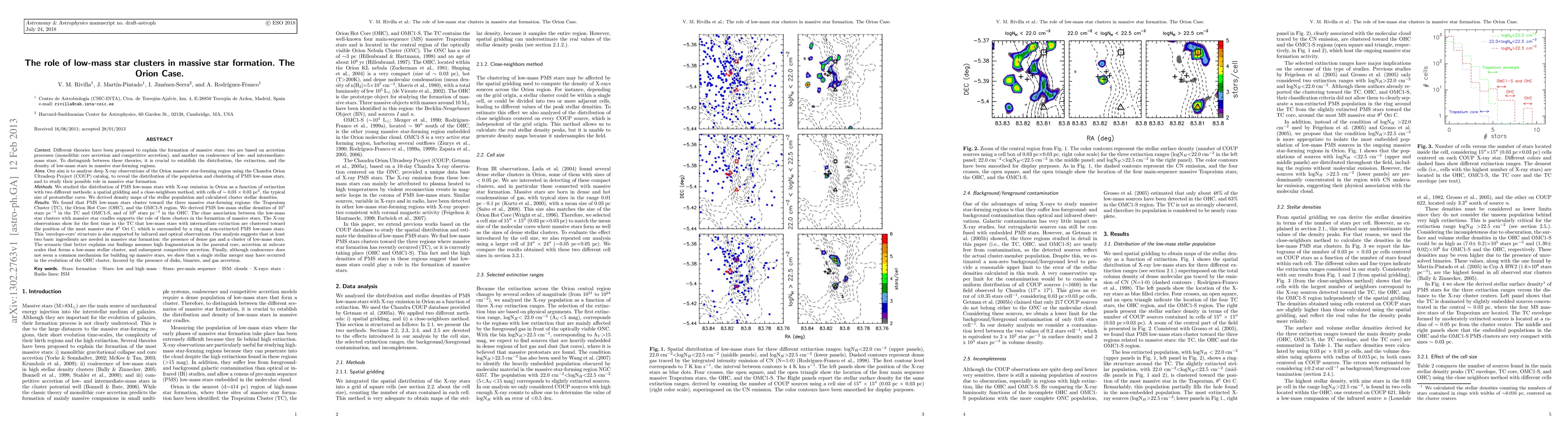 This study uses deep X-ray observations from the COUP catalog to analyze the distribution of low-mass stars in Orion's massive star-forming regions, finding that these stars cluster closely around massive star cradles. The results support the idea that dense low-mass star clusters and fragmented gas are crucial for massive star formation, with competitive accretion and possibly rare stellar mergers playing key roles.
