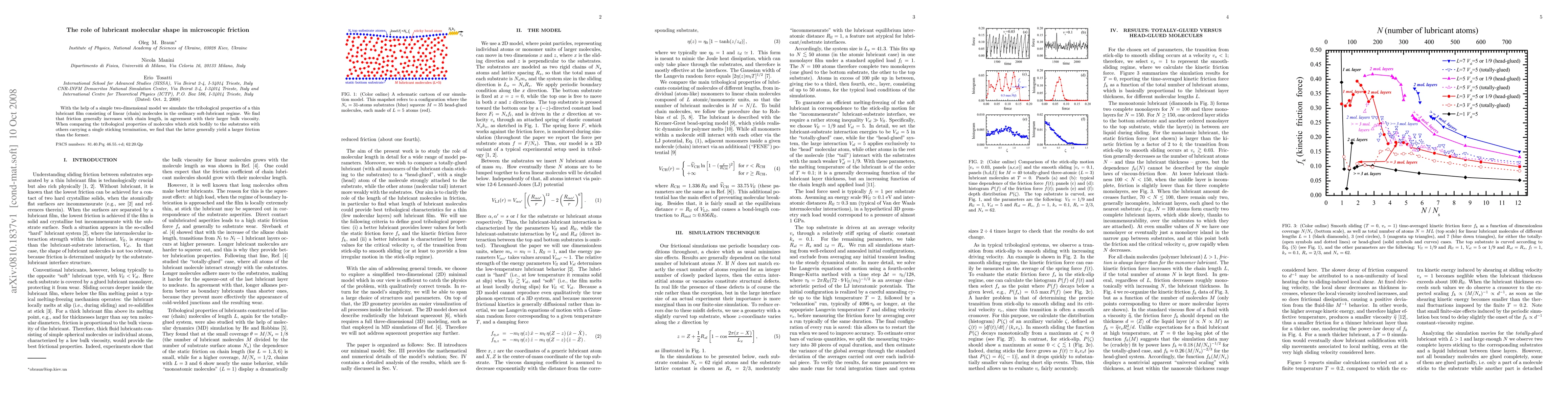 This paper investigates how lubricant molecule shape affects friction in microscopic systems, finding that longer chain molecules increase friction and molecules with a single sticking termination produce more friction than those with bodily attachment.