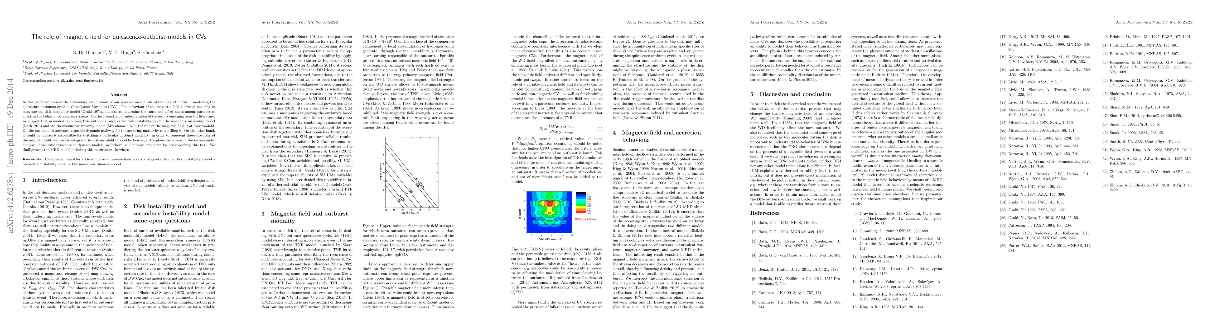 In this paper we present the elementary assumptions of our research on the role of the magnetic field in modelling the quiescence-outbursts cycle in Cataclysmic Variables (CVs). The behaviour of the magnetic field is crucial not only to integrate the disk instability model (Osaki 1974), but also to determine the cause and effect nexus among parameters affecting the behavior of complex systems. On the ground of our interpretation of the results emerging from the literature, we suggest that in models describing DNe outbursts, such as the disk instability model, the secondary instability model (Bath 1973) and the thermonuclear runaway model (Mitrofanov 1978), the role of the magnetic field is at least twofold. On the one hand, it activates a specific dynamic pathway for the accreting matter by channelling it. On the other hand, it could be indirectly responsible for switching a particular outburst modality. In order to represent these two roles of the magnetic field, we need to integrate the disk instability model by looking at the global behaviour of the system under analysis. Stochastic resonance in dynamo models, we believe, is a suitable candidate for accomplishing this task. We shall present the MHD model including this mechanism elsewhere.