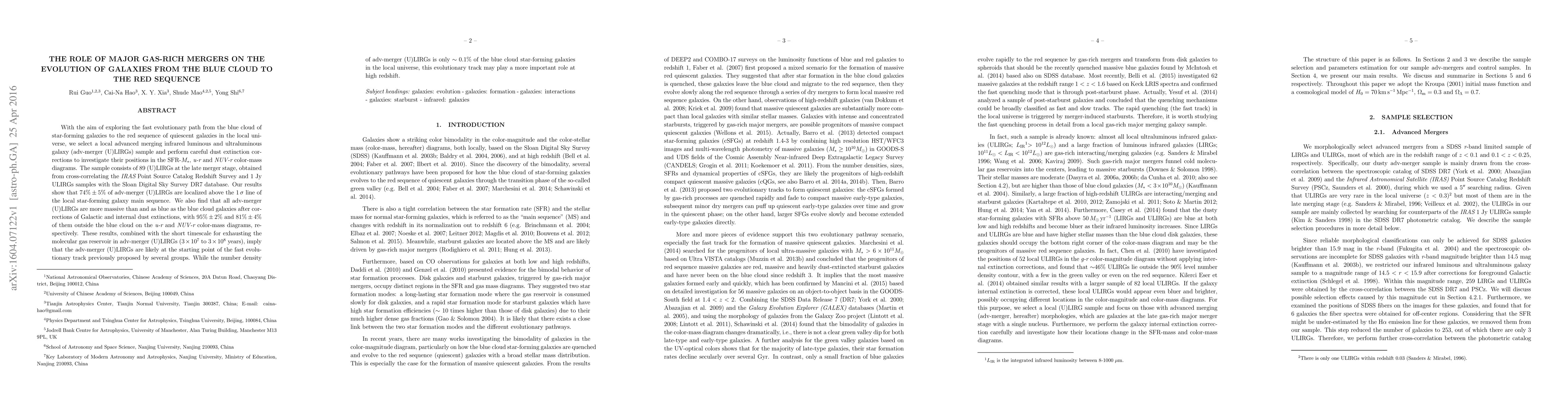 With the aim of exploring the fast evolutionary path from the blue cloud of star-forming galaxies to the red sequence of quiescent galaxies in the local universe, we select a local advanced merging infrared luminous and ultraluminous galaxy (adv-merger (U)LIRGs) sample and perform careful dust extinction corrections to investigate their positions in the SFR-$M_{\ast}$, u-r and NUV-r color-mass diagrams. The sample consists of 89 (U)LIRGs at the late merger stage, obtained from cross-correlating the IRAS Point Source Catalog Redshift Survey and 1 Jy ULIRGs samples with the Sloan Digital Sky Survey DR7 database. Our results show that $74\%\pm 5\%$ of adv-merger (U)LIRGs are localized above the $1\, \sigma$ line of the local star-forming galaxy main sequence. We also find that all adv-merger (U)LIRGs are more massive than and as blue as the blue cloud galaxies after corrections of Galactic and internal dust extinctions, with $95\%\pm 2\%$ and $81\%\pm 4\%$ of them outside the blue cloud on the u-r and NUV-r color-mass diagrams, respectively. These results, combined with the short timescale for exhausting the molecular gas reservoir in adv-merger (U)LIRGs ($3\times 10^{7}$ to $3\times 10^{8}$ years), imply that the adv-merger (U)LIRGs are likely at the starting point of the fast evolutionary track previously proposed by several groups. While the number density of adv-merger (U)LIRGs is only $\sim 0.1\%$ of the blue cloud star-forming galaxies in the local universe, this evolutionary track may play a more important role at high redshift.