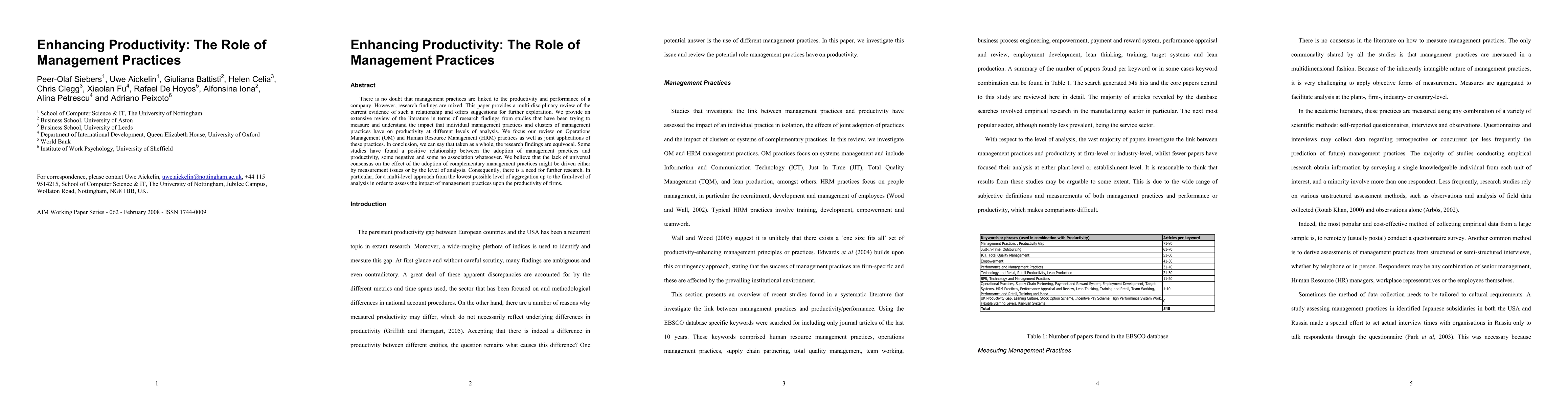 This paper reviews the mixed findings on the relationship between management practices and company productivity, highlighting the need for further multi-disciplinary research, particularly at different levels of analysis to resolve measurement issues and clarify the impact of complementary management practices.