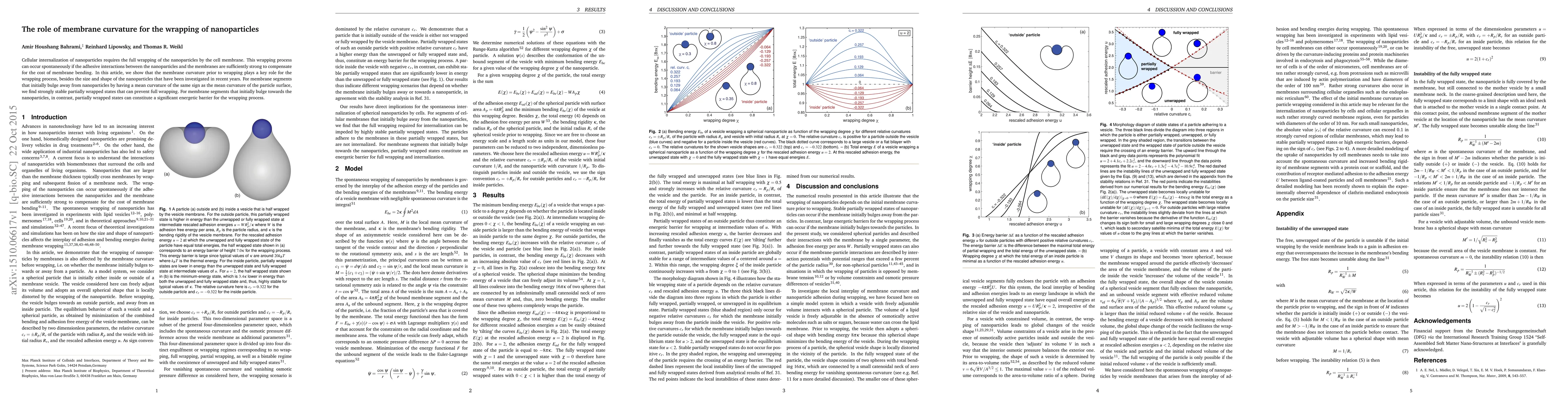 This paper investigates how membrane curvature influences the wrapping of nanoparticles by cell membranes. It finds that membrane segments initially bulging away from nanoparticles hinder full wrapping due to stable partially wrapped states, while those bulging towards the nanoparticles create significant energetic barriers.