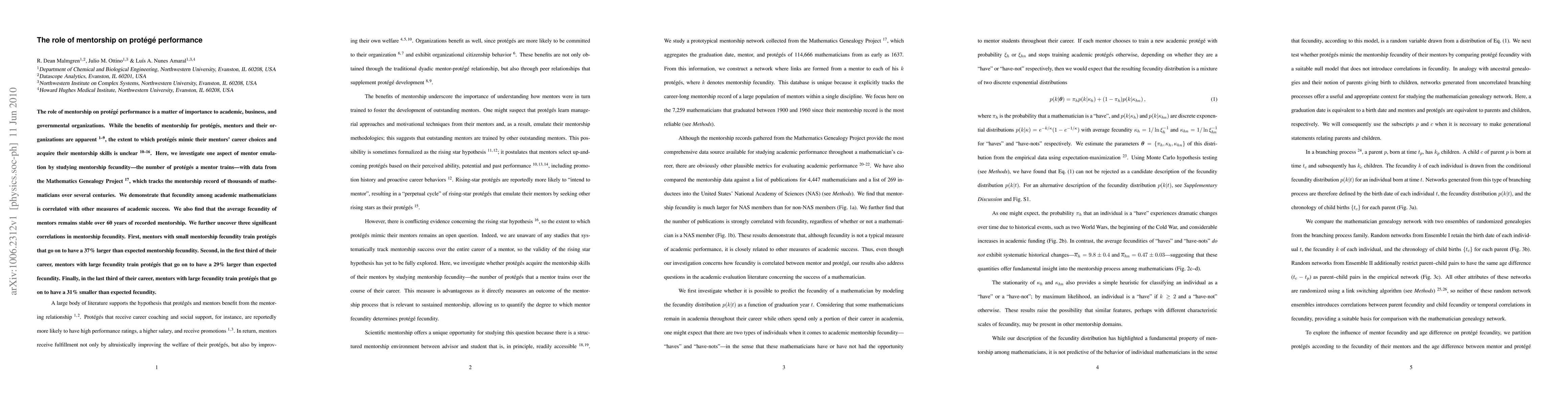 This study examines mentorship fecundity in academic mathematicians, finding that higher mentor success correlates with proteges' future mentorship success. Over six decades, the average fecundity of mentors has remained stable, revealing nuanced patterns in protege emulation based on mentor career stages.