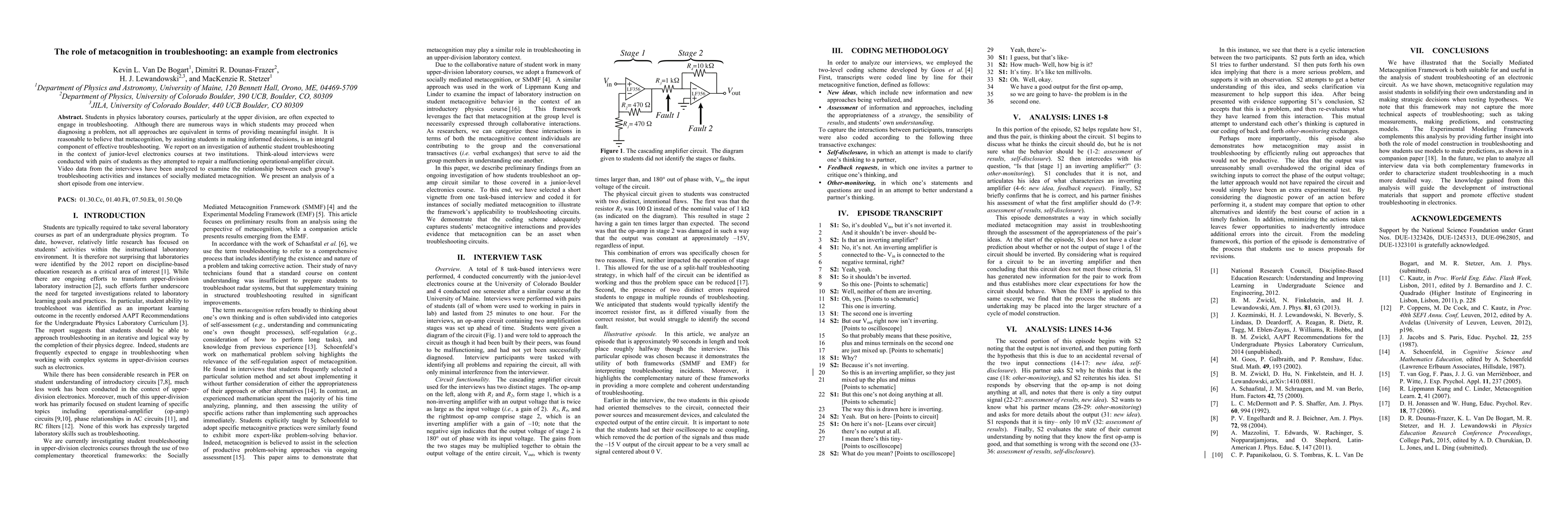 This study investigates how metacognition influences troubleshooting in junior-level electronics courses, using think-aloud interviews of student pairs repairing a circuit. The analysis reveals a connection between socially mediated metacognitive strategies and effective problem-solving in electronics troubleshooting.