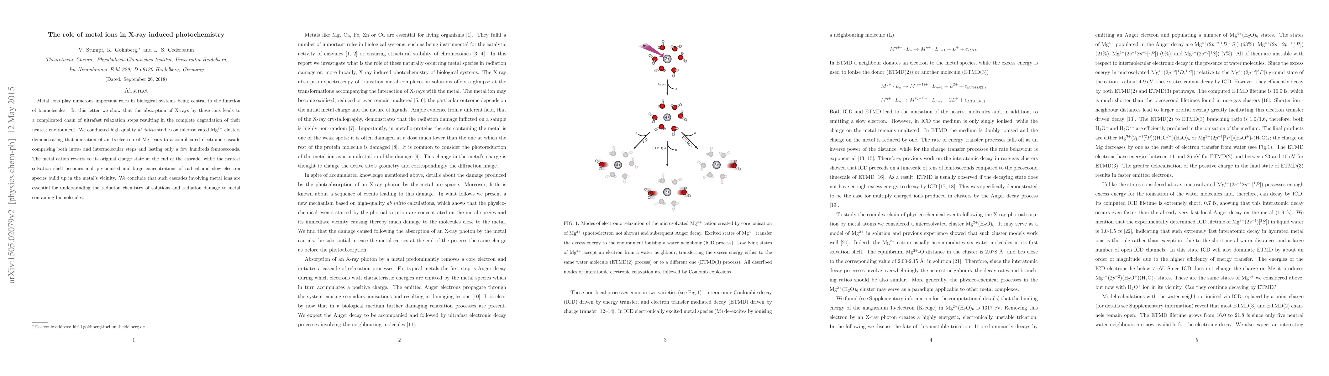 Metal ions play numerous important roles in biological systems being central to the function of biomolecules. In this letter we show that the absorption of X-rays by these ions leads to a complicated chain of ultrafast relaxation steps resulting in the complete degradation of their nearest environment. We conducted high quality ab initio studies on microsolvated Mg clusters demonstrating that ionisation of an 1s-electron of Mg leads to a complicated electronic cascade comprising both intra- and intermolecular steps and lasting only a few hundreds femtoseconds. The metal cation reverts to its original charge state at the end of the cascade, while the nearest solvation shell becomes multiply ionised and large concentrations of radical and slow electron species build up in the metal vicinity. We conclude that such cascades involving metal ions are essential for understanding the radiation chemistry of solutions and radiation damage to metal containing biomolecules.