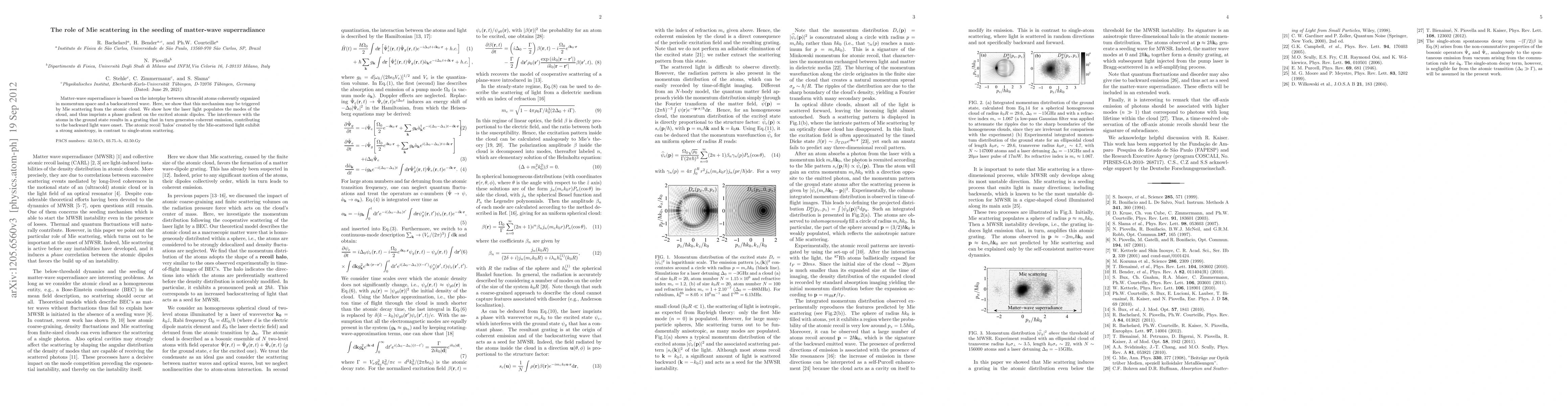 This paper investigates how Mie scattering from an atomic cloud can initiate matter-wave superradiance, demonstrating that laser light populates cloud modes and imprints a phase gradient on atomic dipoles. The resulting interference generates coherent emission, contributing to the onset of a backward light wave.