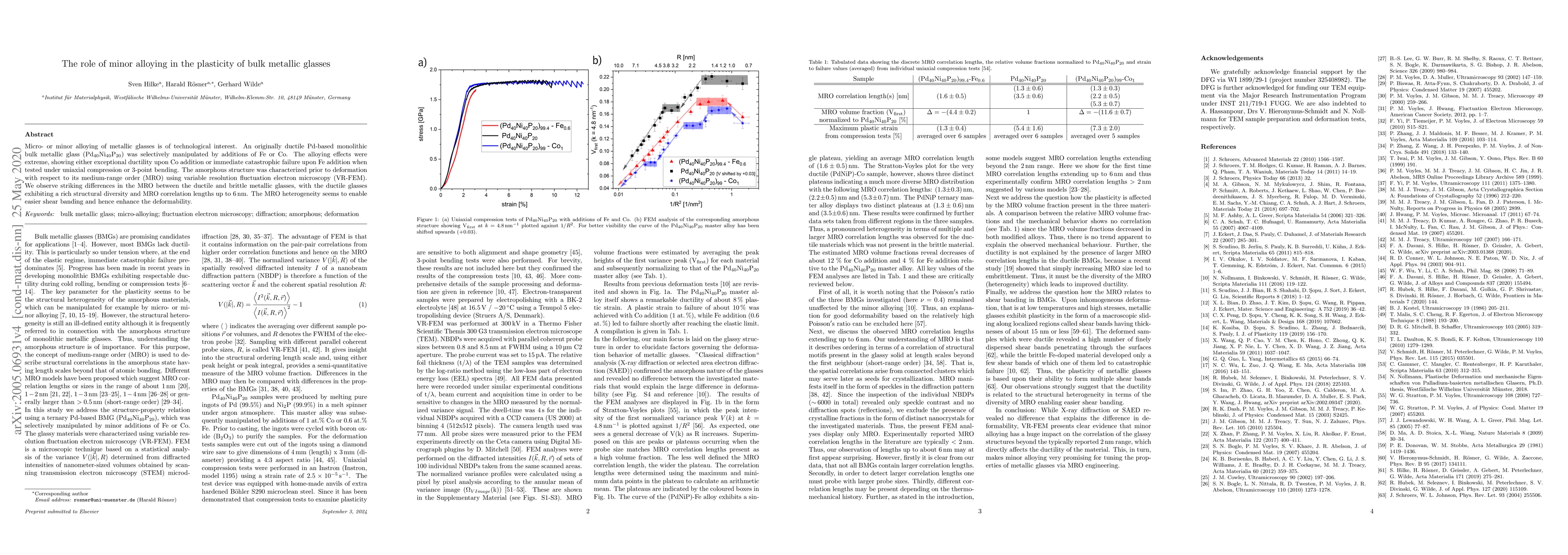 The study utilized variable resolution fluctuation electron microscopy (VR-FEM) to characterize the medium-range order (MRO) of a Pd-based bulk metallic glass (Pd$_{40}$Ni$_{40}$P$_{20}$) before deformation, comparing the effects of minor additions of Fe or Co on its plasticity under uniaxial compression and 3-point bending tests.