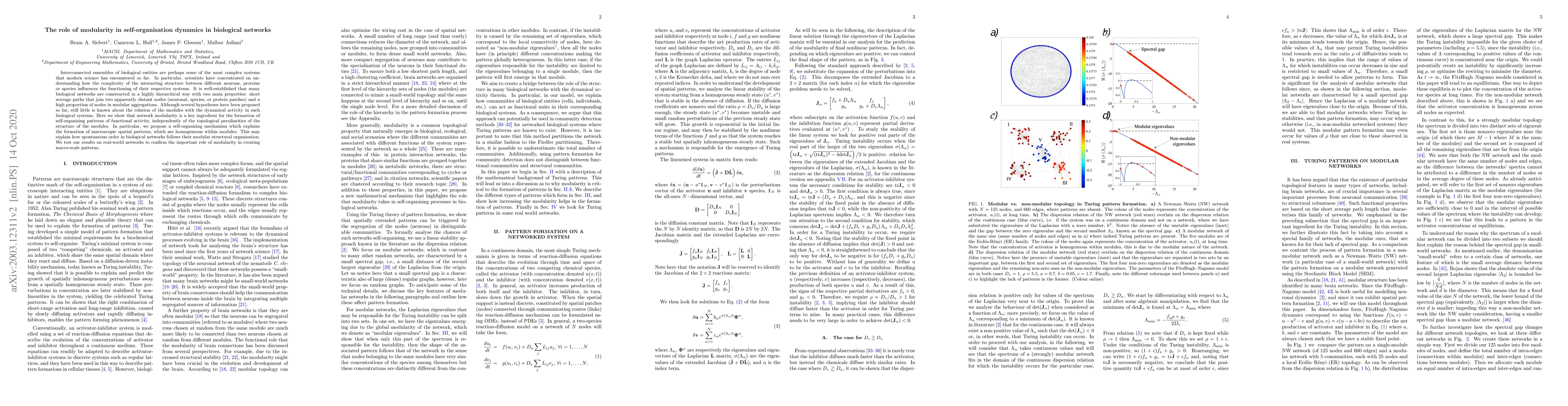 This paper investigates how modularity in biological networks influences self-organisation dynamics, demonstrating that network modularity is crucial for the formation of self-organised functional patterns. The study proposes a self-organising mechanism that explains the emergence of macroscopic spatial patterns, confirming the significant role of modularity in generating macro-scale order in real-world networks.