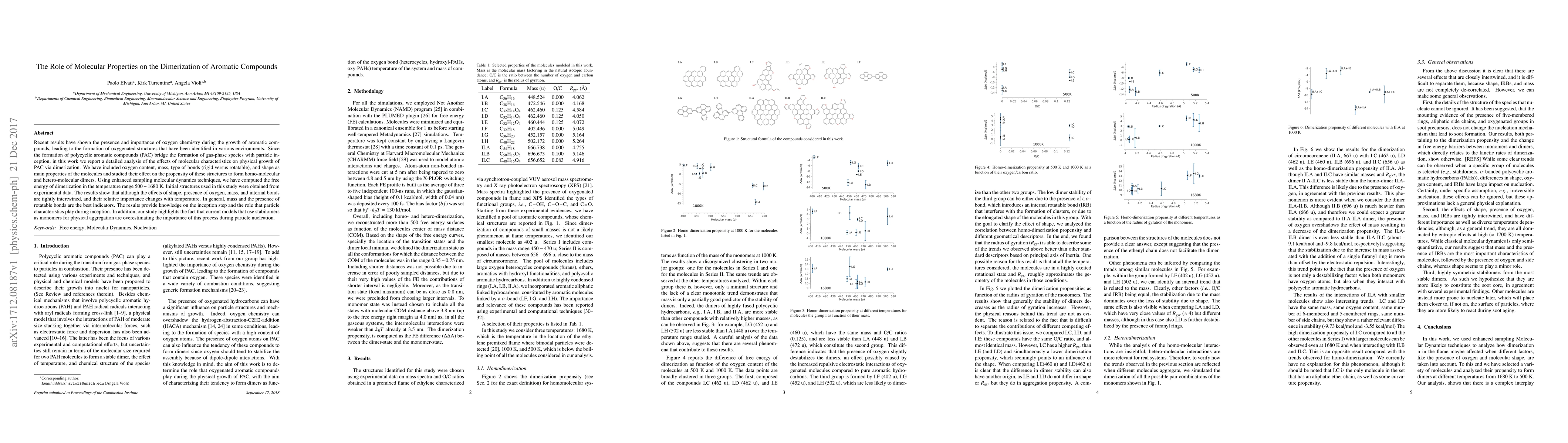 Recent results have shown the presence and importance of oxygen chemistry during the growth of aromatic compounds, leading to the formation of oxygenated structures that have been identified in various environments. Since the formation of polycyclic aromatic compounds (PAC) bridge the formation of gas-phase species with particle inception, in this work we report a detailed analysis of the effects of molecular characteristics on physical growth of PAC via dimerization. We have included oxygen content, mass, type of bonds (rigid versus rotatable), and shape as main properties of the molecules and studied their effect on the propensity of these structures to form homo-molecular and hetero-molecular dimers. Using enhanced sampling molecular dynamics techniques, we have computed the free energy of dimerization in the temperature range $500-1680$~K. Initial structures used in this study were obtained from experimental data. The results show that although the effects of shape, presence of oxygen, mass, and internal bonds are tightly intertwined, and their relative importance changes with temperature. In general, mass and the presence of rotatable bonds are the best indicators. The results provide knowledge on the inception step and the role that particle characteristics play during inception. In addition, our study highlights the fact that current models that use stabilomers as monomers for physical aggregation are overestimating the importance of this process during particle nucleation.