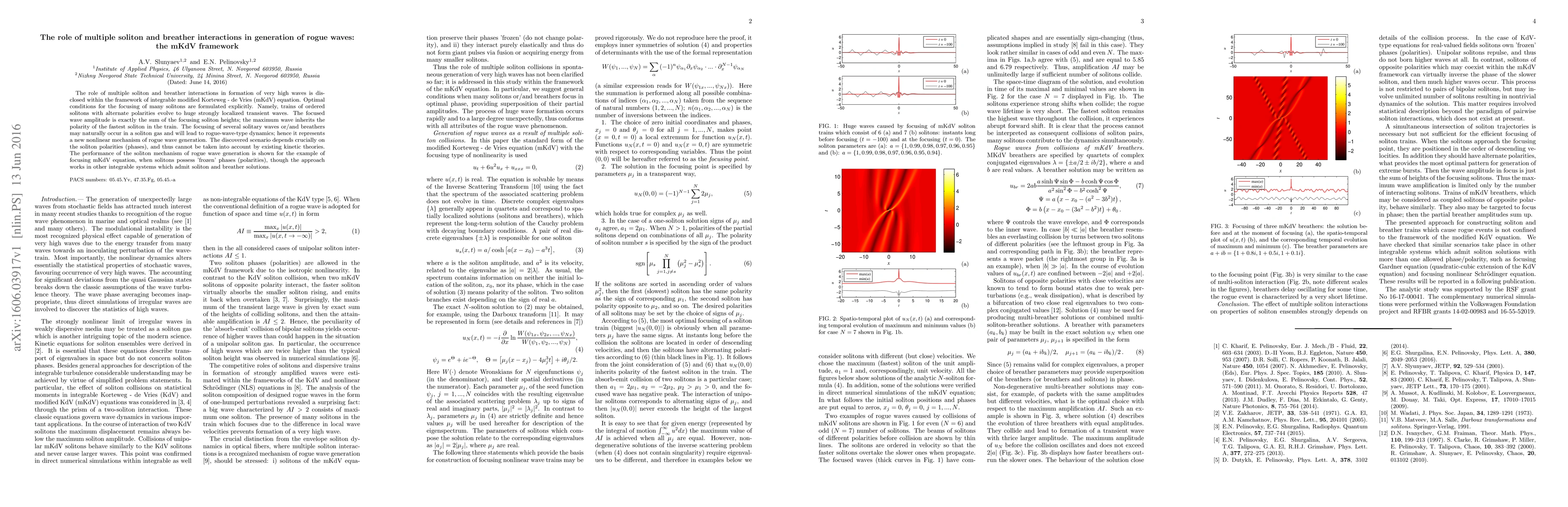 This paper explores how interactions between multiple solitons and breathers within the mKdV framework generate rogue waves, revealing that trains of solitons with alternating polarities can evolve into large, localized waves. The study highlights a new nonlinear mechanism for rogue wave formation that depends on soliton polarities, differing from existing kinetic theories.