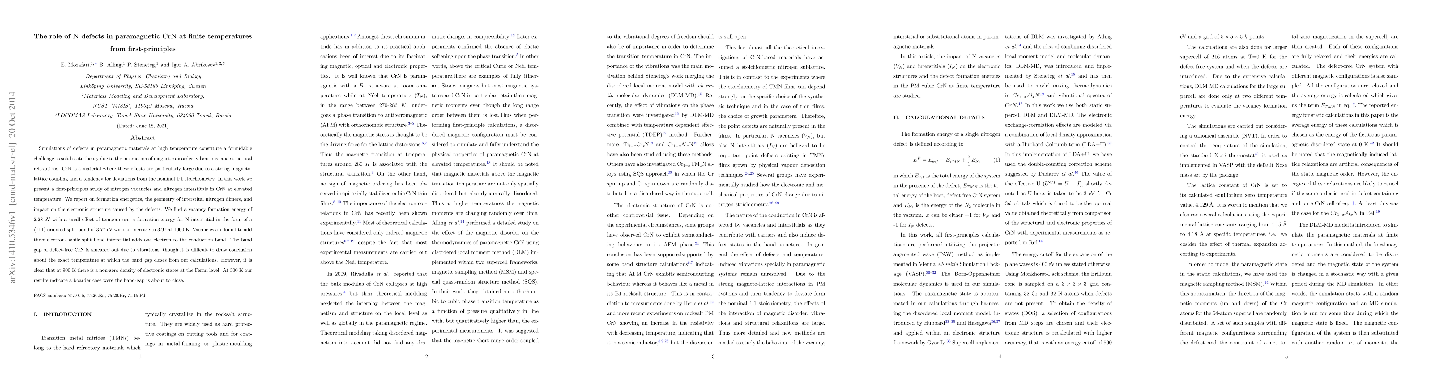 Simulations of defects in paramagnetic materials at high temperature constitute a formidable challenge to solid state theory due to the interaction of magnetic disorder, vibrations, and structural relaxations. CrN is a material where these effects are particularly large due to a strong magneto-lattice coupling and a tendency for deviations from the nominal 1:1 stoichiometry. In this work we present a first-principles study of nitrogen vacancies and nitrogen interstitals in CrN at elevated temperature. We report on formation energetics, the geometry of interstital nitrogen dimers, and impact on the electronic structure caused by the defects. We find a vacancy formation energy of 2.28 eV with a small effect of temperature, a formation energy for N interstitial in the form of a $\big<111\big>$ oriented split-bond of 3.77 eV with an increase to 3.97 at 1000 K. Vacancies are found to add three electrons while split bond interstitial adds one electron to the conduction band. The band gap of defect-free CrN is smeared out due to vibrations, though it is difficult to draw conclusion about the exact temperature at which the band gap closes from our calculations. However, it is clear that at 900 K there is a non-zero density of electronic states at the Fermi level. At 300 K our results indicate a boarder case were the band-gap is about to close.
