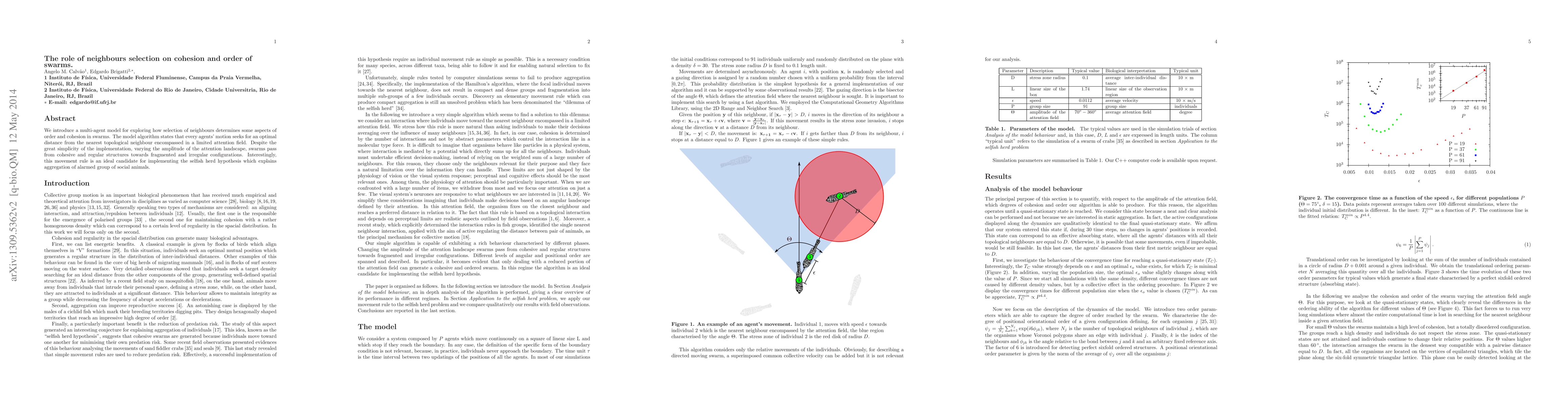 We introduce a multi-agent model for exploring how selection of neighbours determines some aspects of order and cohesion in swarms. The model algorithm states that every agents' motion seeks for an optimal distance from the nearest topological neighbour encompassed in a limited attention field. Despite the great simplicity of the implementation, varying the amplitude of the attention landscape, swarms pass from cohesive and regular structures towards fragmented and irregular configurations. Interestingly, this movement rule is an ideal candidate for implementing the selfish herd hypothesis which explains aggregation of alarmed group of social animals.