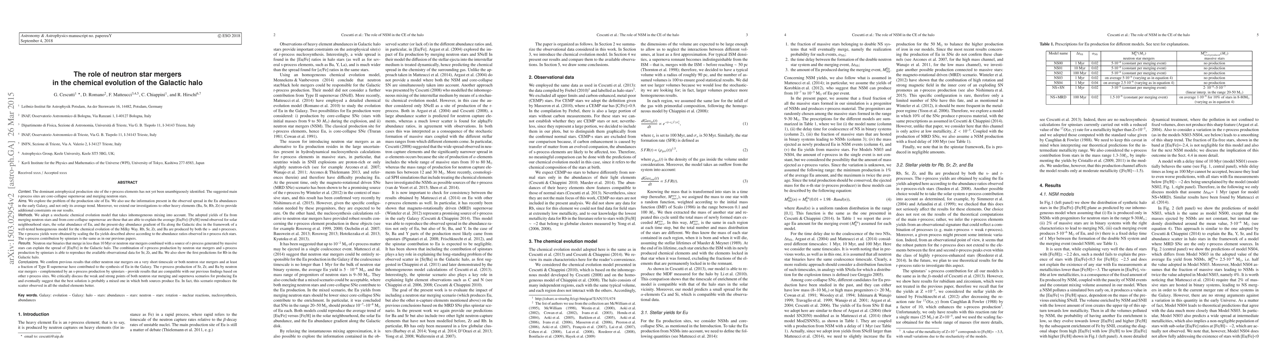 This paper investigates the role of neutron star mergers (NSM) in the chemical evolution of the Galactic halo, focusing on the production of heavy elements like Eu, Ba, Sr, Rb, and Zr. It concludes that NSM with short merger times or combined with r-process contributions from massive stars can explain the observed abundance spread, suggesting a mixed scenario of NSM and core-collapse supernovae as the best fit for Eu synthesis.
