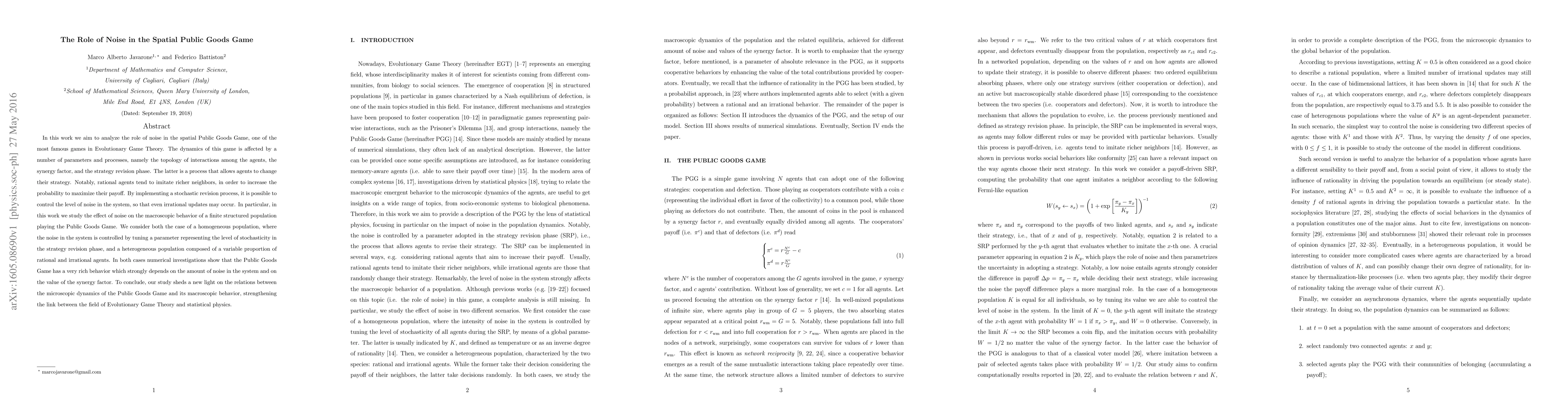 This paper explores how noise influences the dynamics of the Spatial Public Goods Game in Evolutionary Game Theory, examining both homogeneous and heterogeneous populations. It finds that noise significantly affects the macroscopic behavior, highlighting the interplay between microscopic dynamics and macroscopic outcomes, and linking Evolutionary Game Theory with statistical physics.